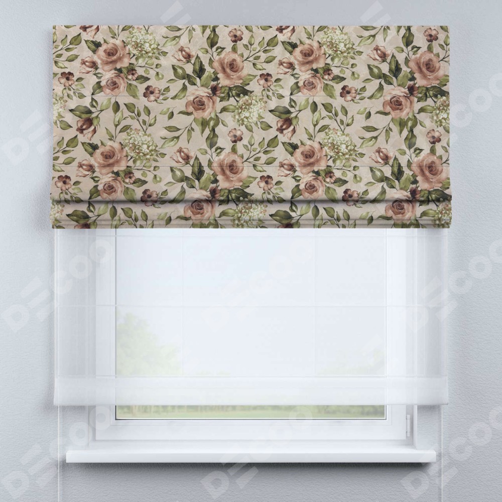 Римская штора день-ночь производителя «Cortin», используется для проёма, пошита из двух полотен, с лицевой стороны «Розы бежевые» артикул 34564, вторая ткань тюль (по стандарту комплектуется тюль белого цвета артикул V-01). Имеет универсальный механизм и подходит для монтажа: на потолок, на стену и в нишу.