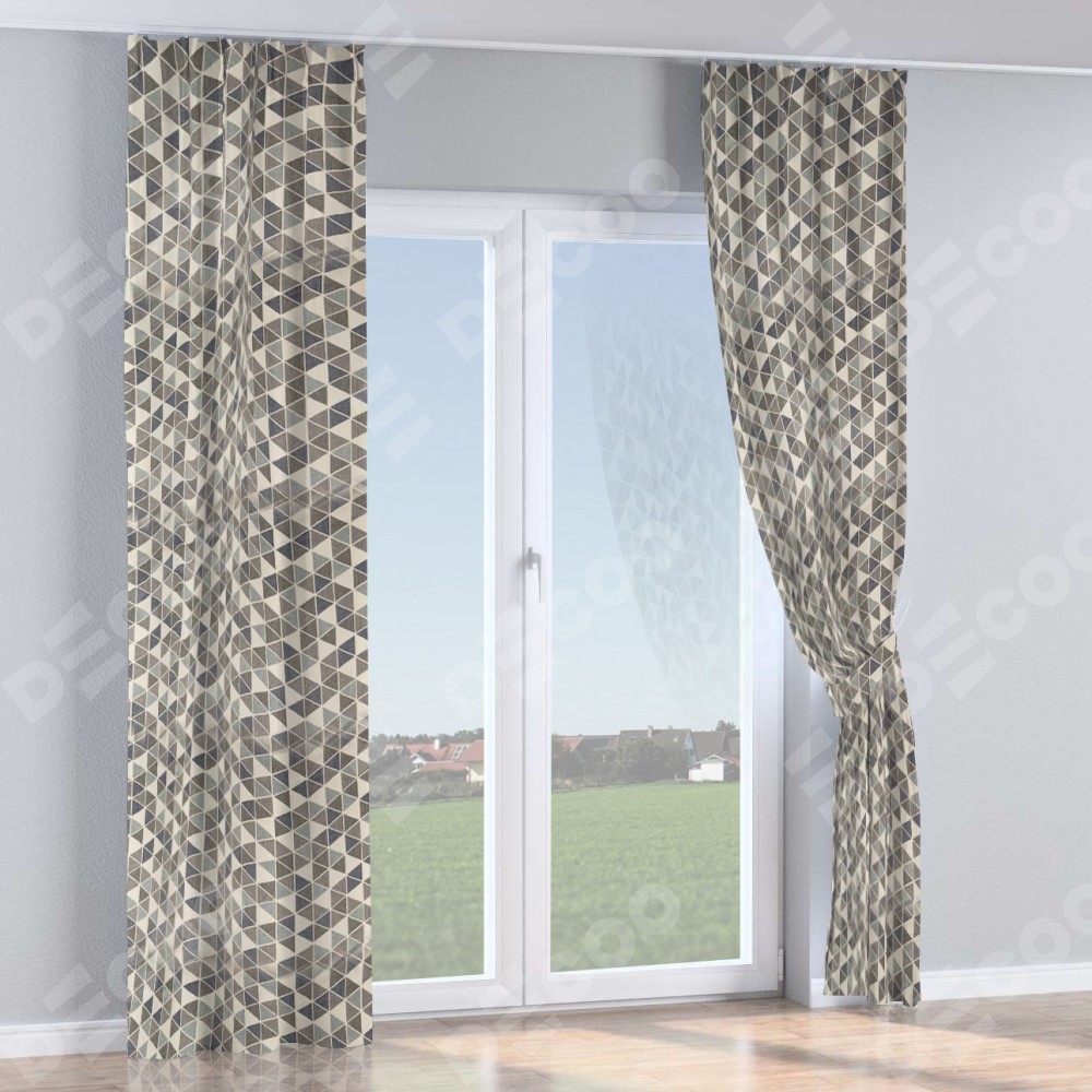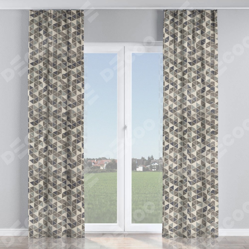 Комплект прямых штор, от производителя «Cortin», пошиты из ткани димаут «Треугольники синие», артикул ткани 23022. С изнаночной стороны в верхней части штор пристрачивается шторная лента с декоративными складками «Кустик». Для создания элегантных складок прямые шторы шьются по стандарту с коэффициентом 1:2 (на 100 см. ширины проёма 200 см. ширины ткани).