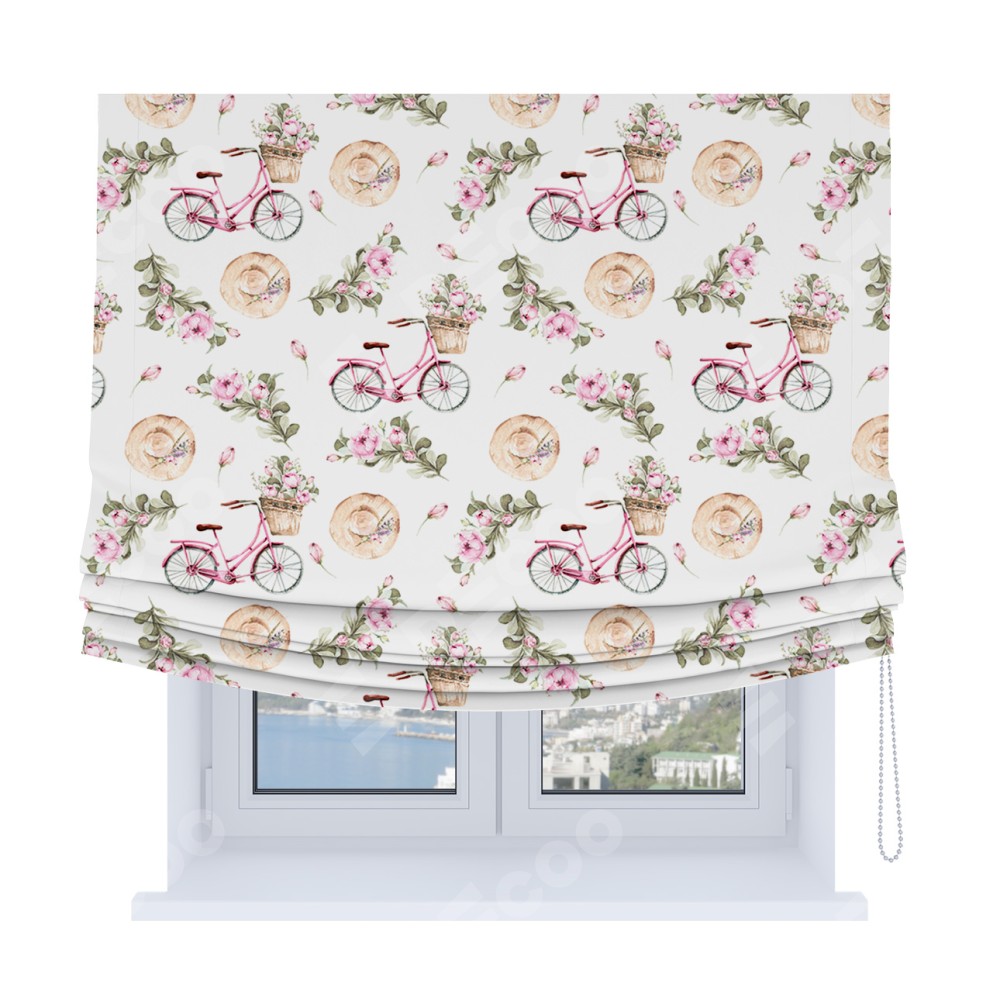 Римская штора Soft производителя «Cortin», используется для проёма, пошита из ткани блэкаут с нанесением сублимационной печати «Розовый велосипед». Имеет универсальный механизм и подходит для монтажа: на потолок, на стену и в нишу. В отличие от стандартных римских штор, римская штора Soft не имеет горизонтальных вставок и нижнего отвеса. Это позволяет ткани произвольно драпироваться в свободные мягкие складки.
