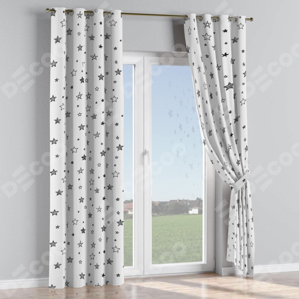Комплект прямых штор, от производителя «Cortin», пошиты из ткани блэкаут с нанесением сублимационной печати «Звёзды». Данная модель пошита на люверсах, комплектуется на выбор круглым карнизом и подходит для монтажа на стену или потолок. Прямые шторы на люверсах шьются по стандарту с коэффициентом 1/2 (на 100 см. ширины проёма 200 см. ширины ткани), отличительным преимуществом данной модели является простой способ монтажа. Достаточно повесить ее на трубу и штора готова!
