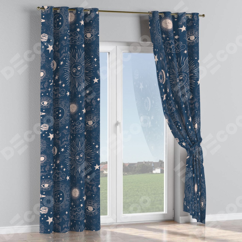 Комплект прямых штор, от производителя «Cortin», пошиты из ткани блэкаут с нанесением сублимационной печати «Звёзды и планеты». Данная модель пошита на люверсах, комплектуется на выбор круглым карнизом и подходит для монтажа на стену или потолок. Прямые шторы на люверсах шьются по стандарту с коэффициентом 1/2 (на 100 см. ширины проёма 200 см. ширины ткани), отличительным преимуществом данной модели является простой способ монтажа. Достаточно повесить ее на трубу и штора готова!