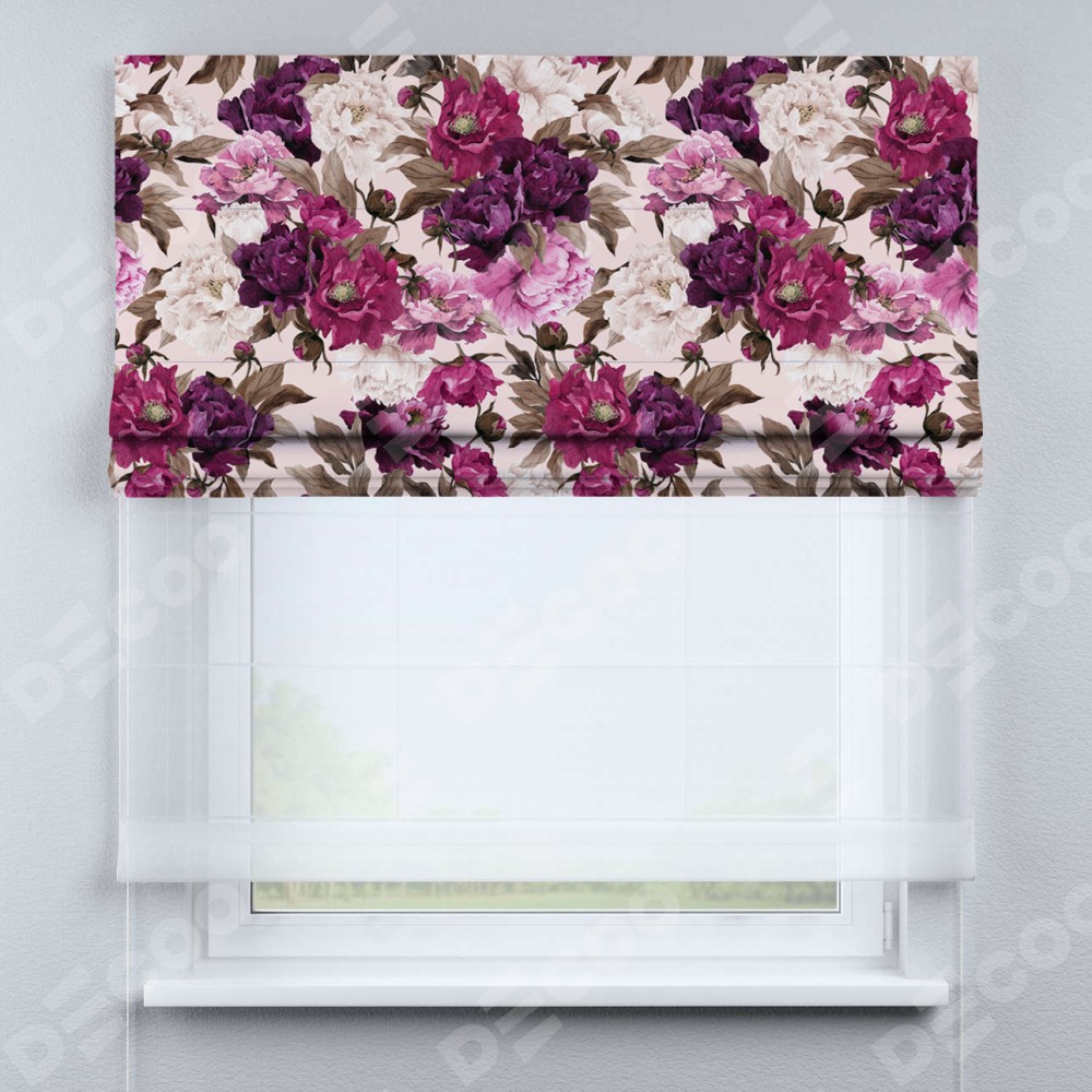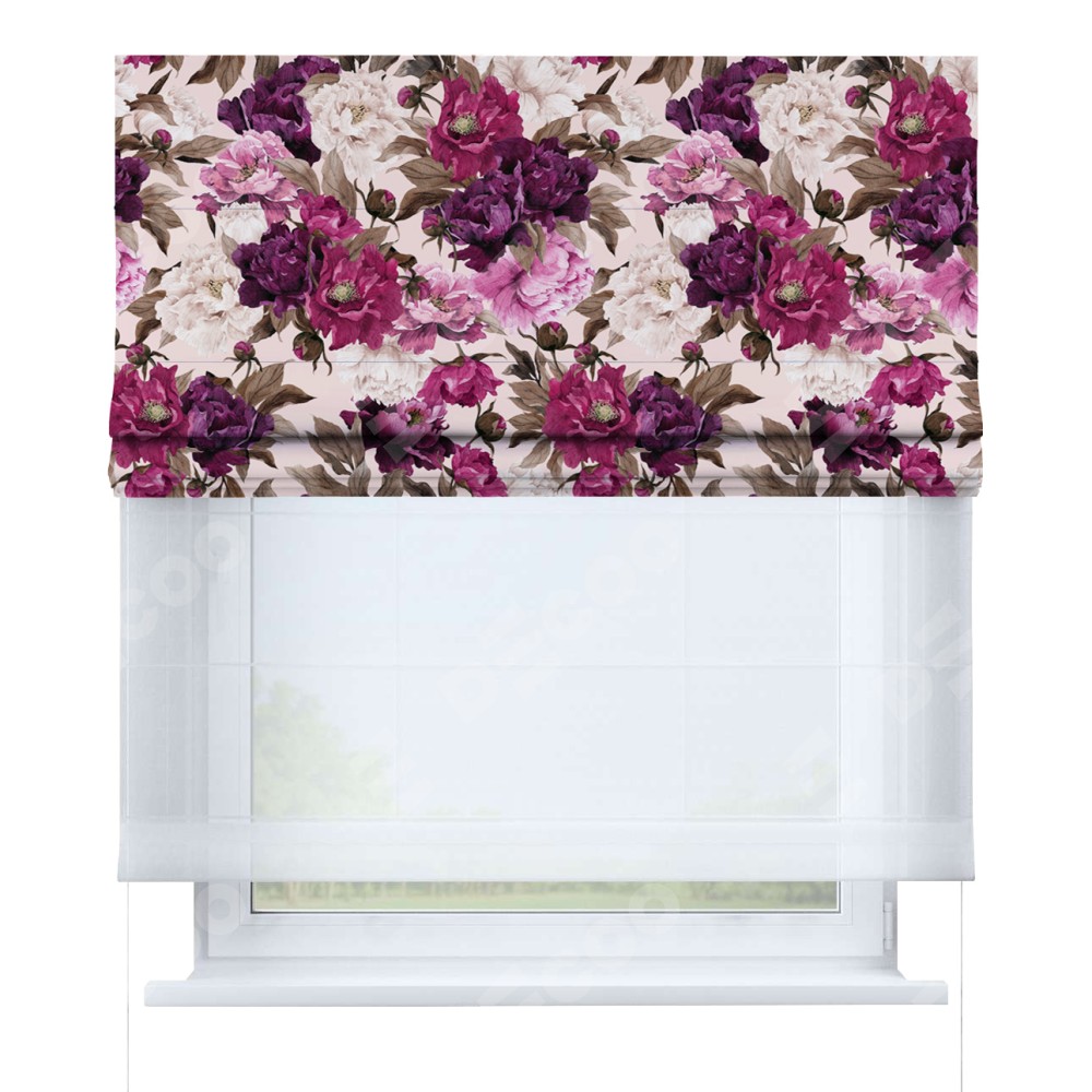 Римская штора день-ночь производителя «Cortin», используется для проёма, пошита из двух полотен, с лицевой блэкаут с нанесением сублимационной печати «Великолепные пионы», вторая ткань тюль (по стандарту комплектуется тюль белого цвета артикул V-01). Имеет универсальный механизм и подходит для монтажа: на потолок, на стену и в нишу.