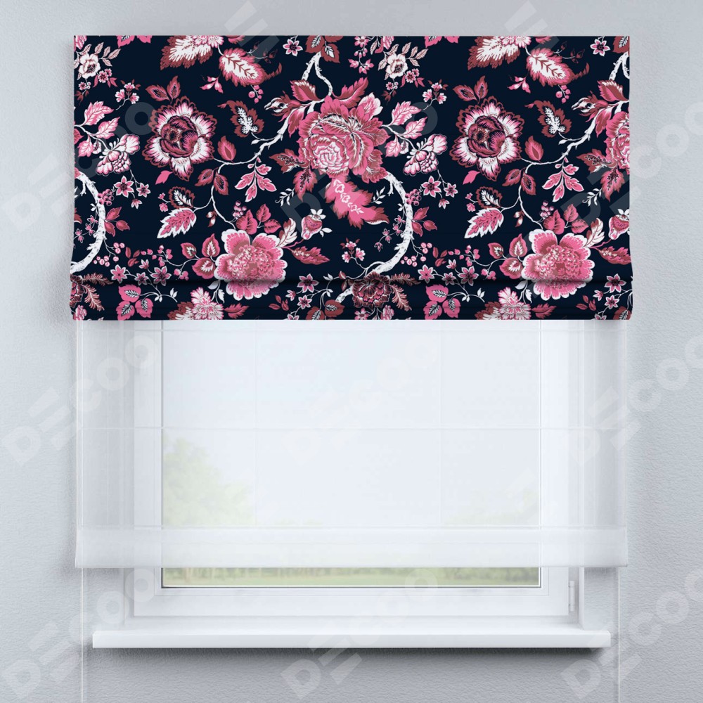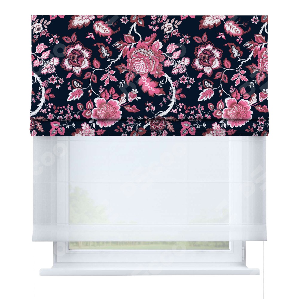 Римская штора день-ночь производителя «Cortin», используется для проёма, пошита из двух полотен, с лицевой блэкаут с нанесением сублимационной печати «Бал цветов», вторая ткань тюль (по стандарту комплектуется тюль белого цвета артикул V-01). Имеет универсальный механизм и подходит для монтажа: на потолок, на стену и в нишу.