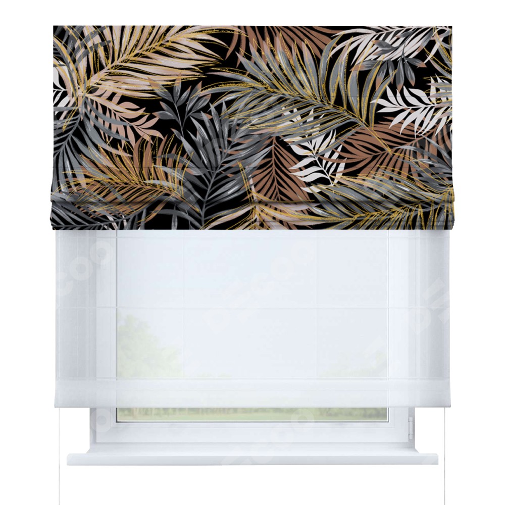 Римская штора день-ночь производителя «Cortin», используется для проёма, пошита из двух полотен, с лицевой блэкаут с нанесением сублимационной печати «Закат в тропиках», вторая ткань тюль (по стандарту комплектуется тюль белого цвета артикул V-01). Имеет универсальный механизм и подходит для монтажа: на потолок, на стену и в нишу.