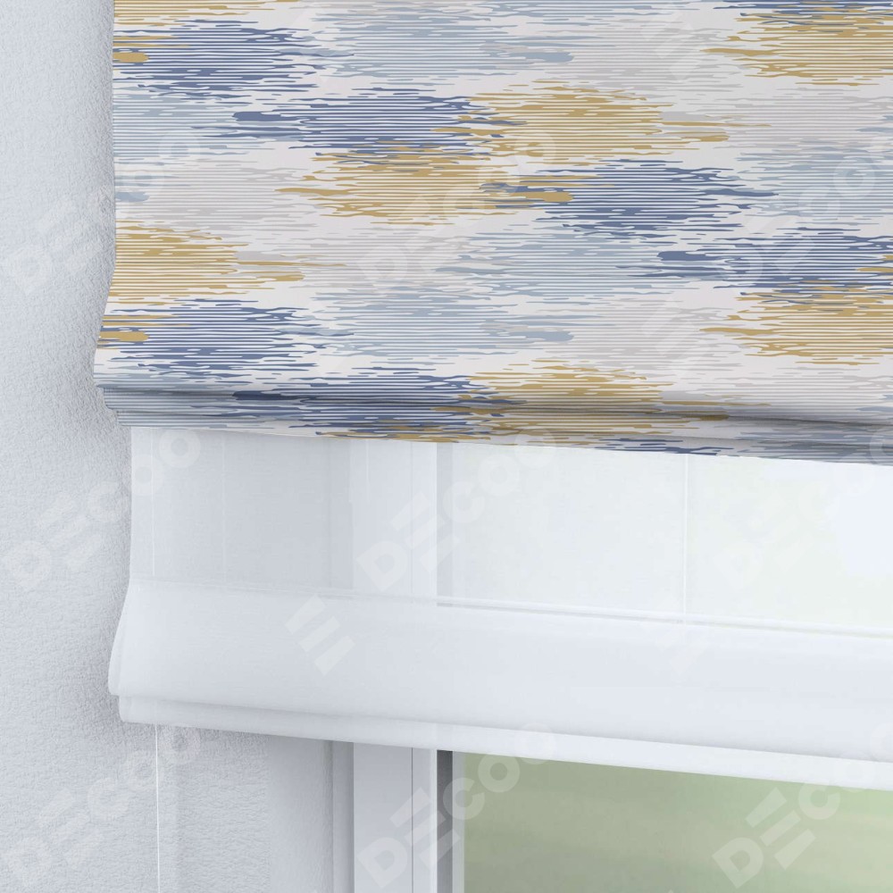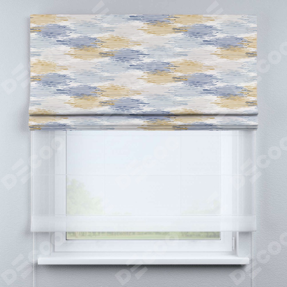 Римская штора день-ночь производителя «Cortin», используется для проёма, пошита из двух полотен, с лицевой блэкаут с нанесением сублимационной печати «Полосатая волна», вторая ткань тюль (по стандарту комплектуется тюль белого цвета артикул V-01). Имеет универсальный механизм и подходит для монтажа: на потолок, на стену и в нишу.