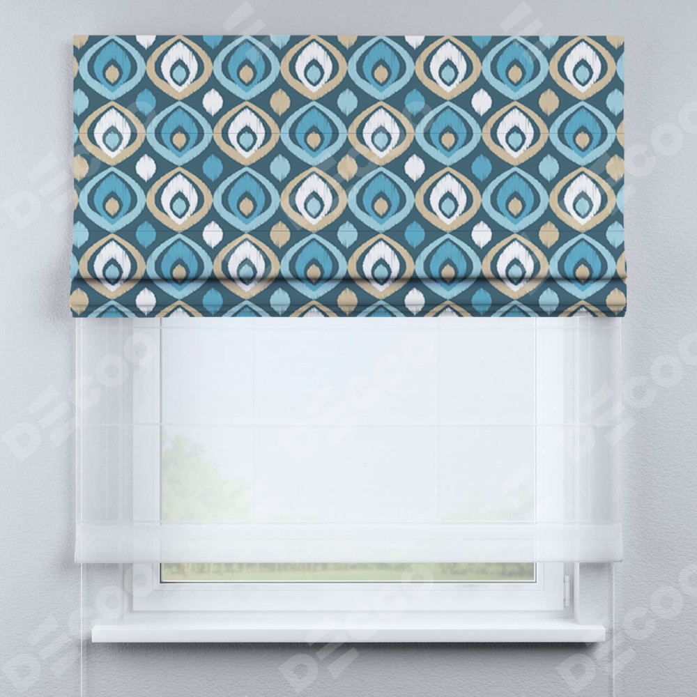 Римская штора день-ночь производителя «Cortin», используется для проёма, пошита из двух полотен, с лицевой блэкаут с нанесением сублимационной печати «Икат орнамент», вторая ткань тюль (по стандарту комплектуется тюль белого цвета артикул V-01). Имеет универсальный механизм и подходит для монтажа: на потолок, на стену и в нишу.