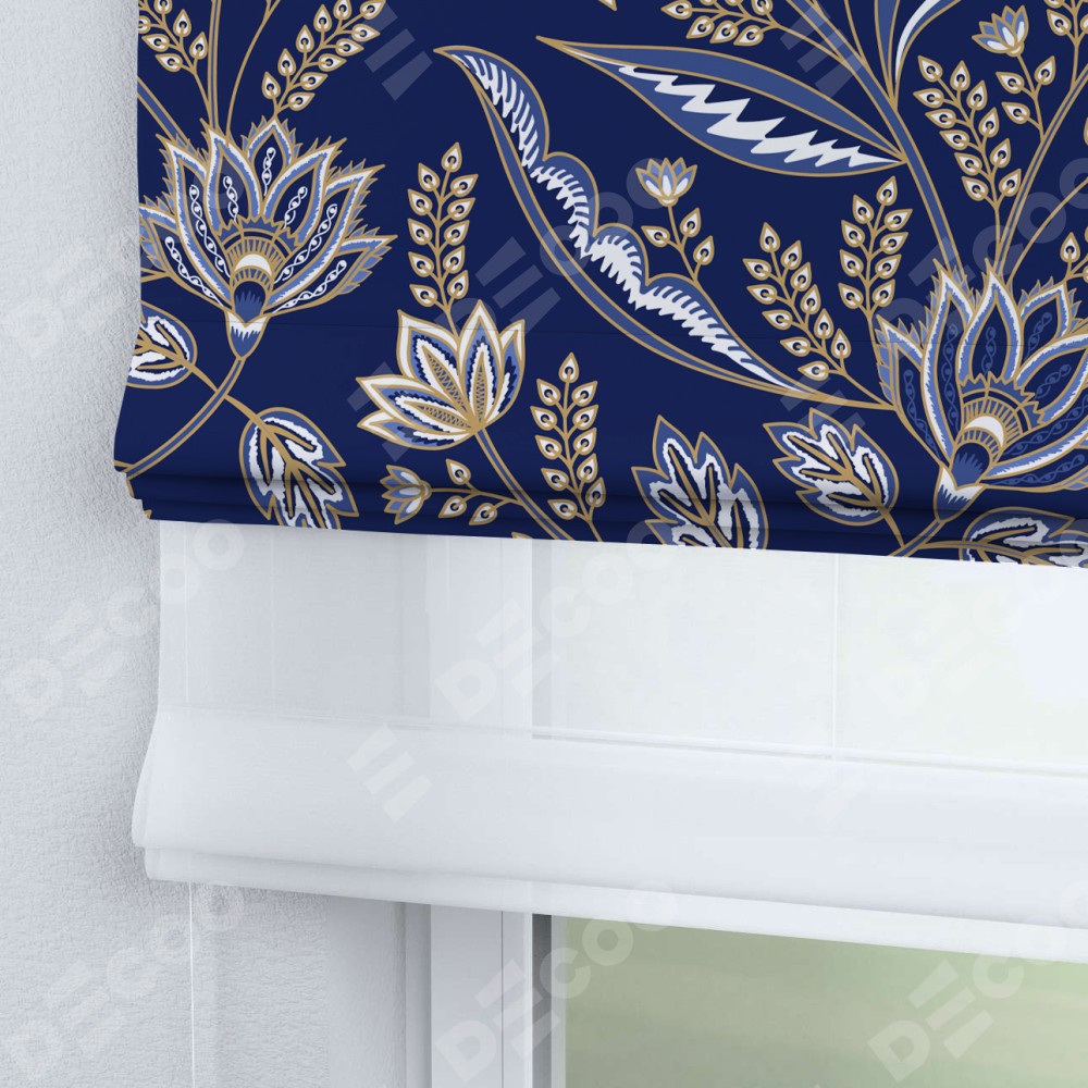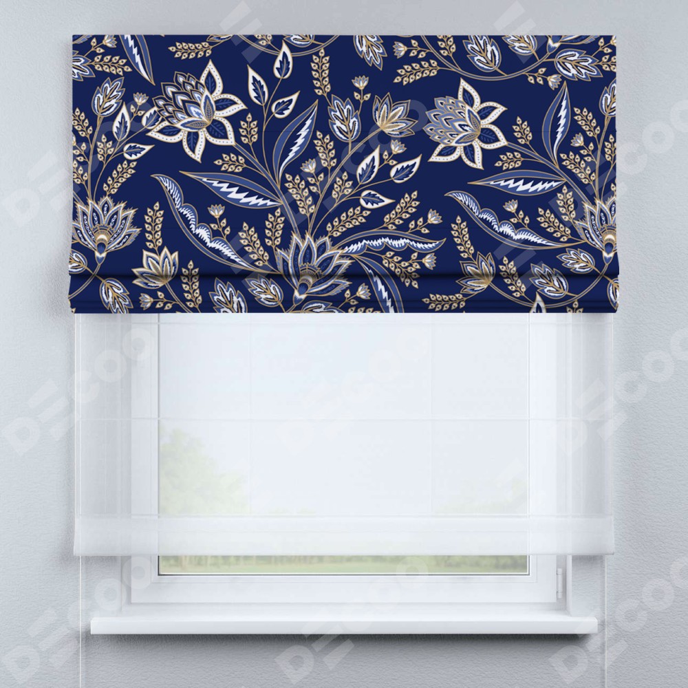 Римская штора день-ночь производителя «Cortin», используется для проёма, пошита из двух полотен, с лицевой блэкаут с нанесением сублимационной печати «Индиго батик», вторая ткань тюль (по стандарту комплектуется тюль белого цвета артикул V-01). Имеет универсальный механизм и подходит для монтажа: на потолок, на стену и в нишу.