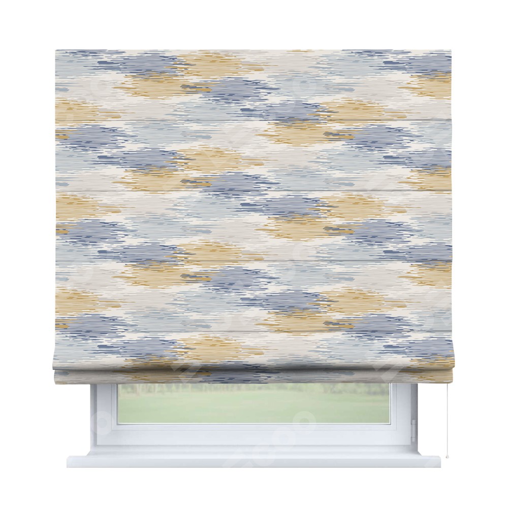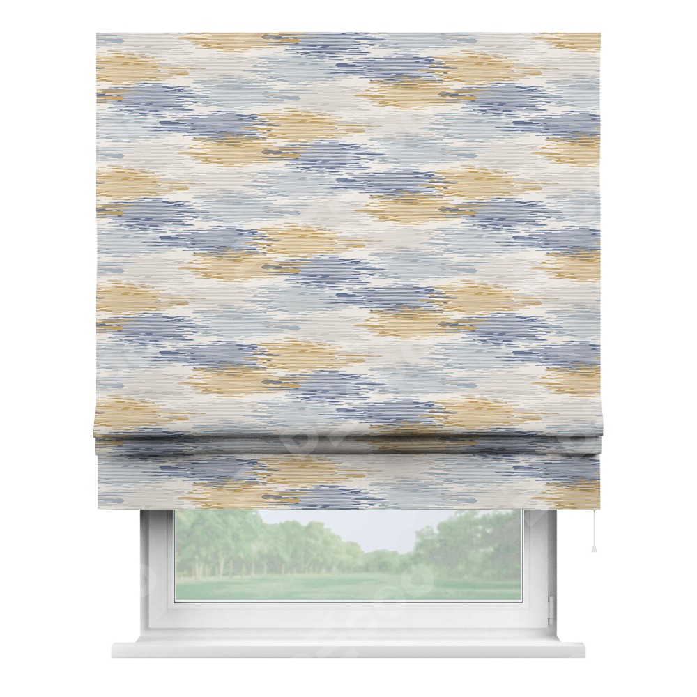 Римская штора производителя «Cortin», используется для проёма, пошита из ткани блэкаут с нанесением сублимационной печати «Полосатая волна». Имеет универсальный механизм и подходит для монтажа: на потолок, на стену и в нишу.