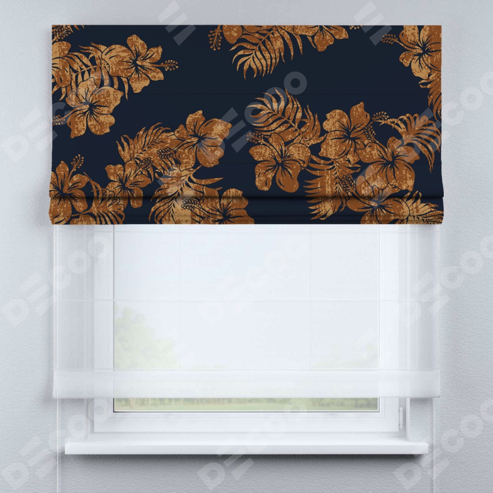 Римская штора день-ночь производителя «Cortin», используется для проёма, пошита из двух полотен, с лицевой блэкаут с нанесением сублимационной печати «Китайская роза», вторая ткань тюль (по стандарту комплектуется тюль белого цвета артикул V-01). Имеет универсальный механизм и подходит для монтажа: на потолок, на стену и в нишу.