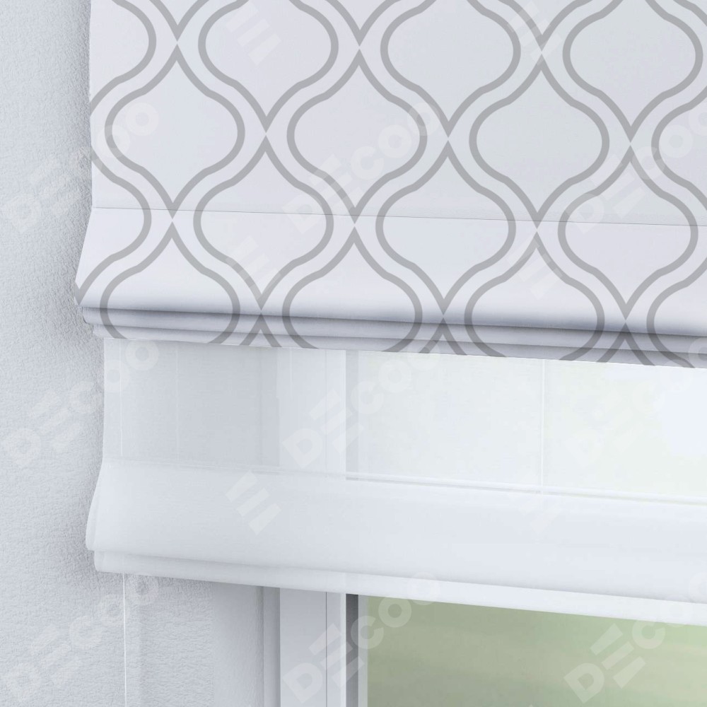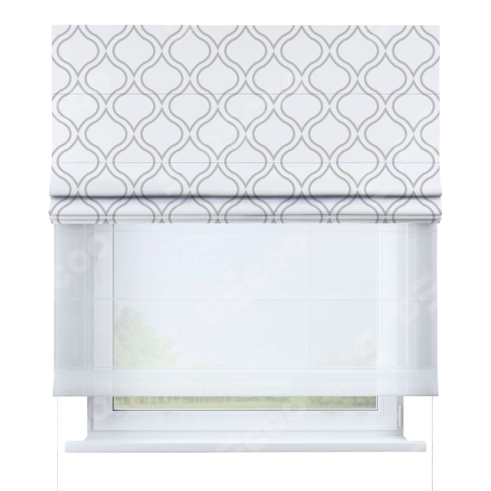 Римская штора день-ночь производителя «Cortin», используется для проёма, пошита из двух полотен, с лицевой блэкаут с нанесением сублимационной печати «Тайны востока белый», вторая ткань тюль (по стандарту комплектуется тюль белого цвета артикул V-01). Имеет универсальный механизм и подходит для монтажа: на потолок, на стену и в нишу.