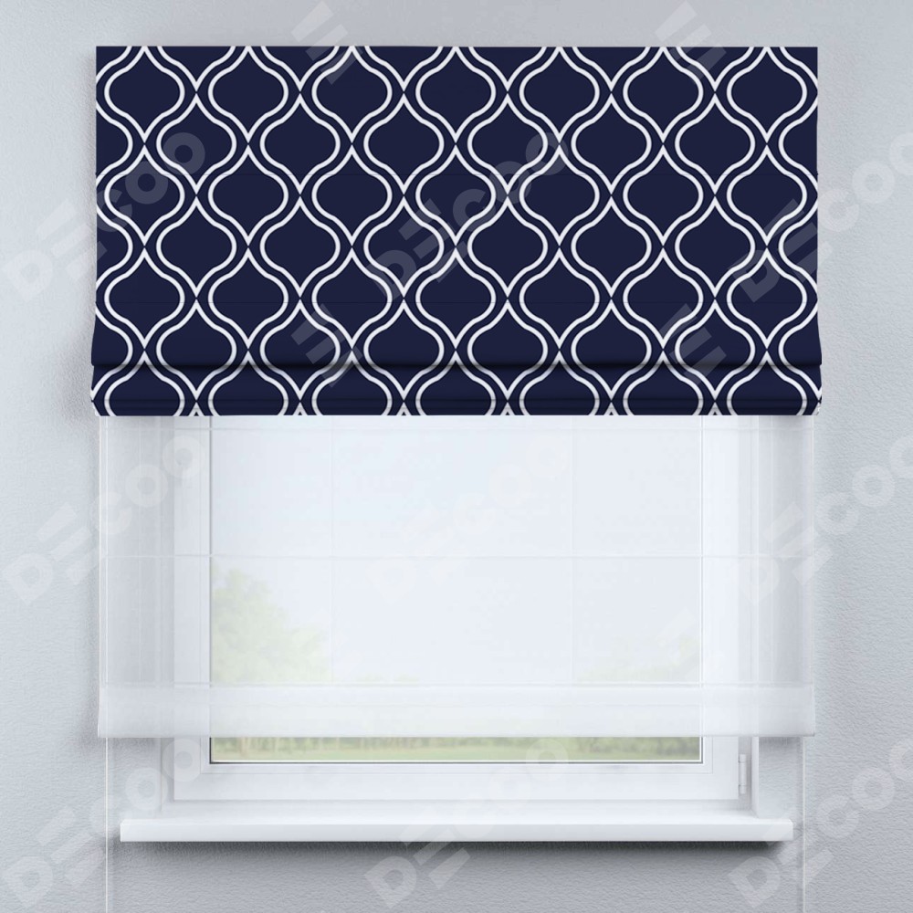 Римская штора день-ночь производителя «Cortin», используется для проёма, пошита из двух полотен, с лицевой блэкаут с нанесением сублимационной печати «Тайны востока синий», вторая ткань тюль (по стандарту комплектуется тюль белого цвета артикул V-01). Имеет универсальный механизм и подходит для монтажа: на потолок, на стену и в нишу.