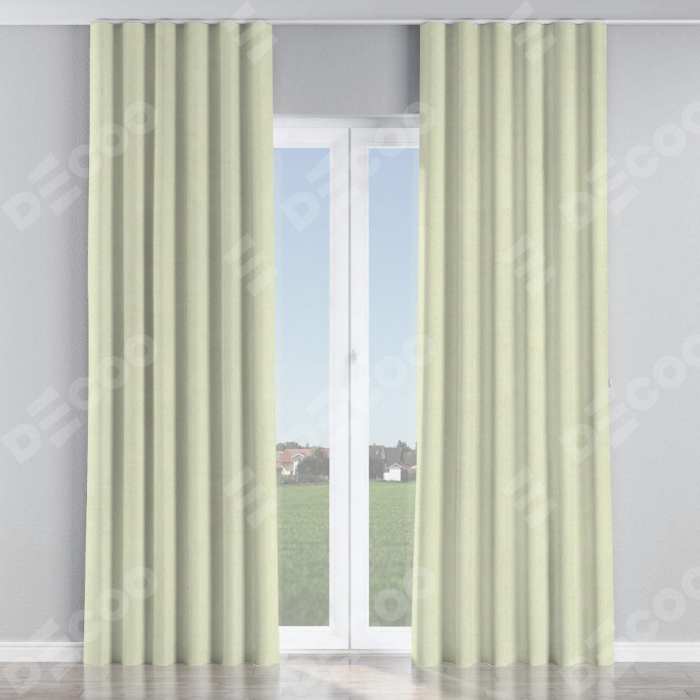 Комплект прямых штор, от производителя «Cortin», пошиты из ткани блэкаут однотонный сливочный, артикул ткани 6668−02. С изнаночной стороны в верхней части штор пристрачивается шторная лента с декоративными складками «Волна». Для создания элегантных складок прямые шторы шьются по стандарту с коэффициентом 1:2 (на 100 см. ширины проёма 200 см. ширины ткани).