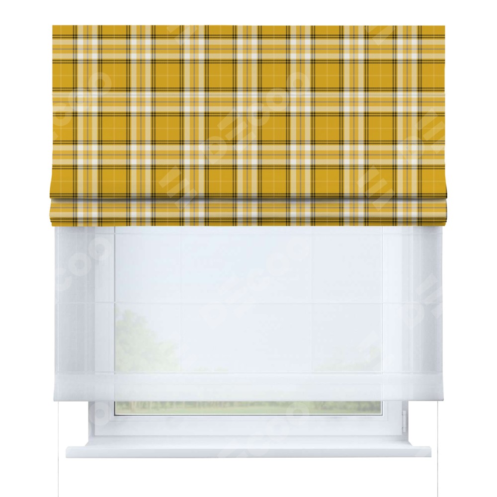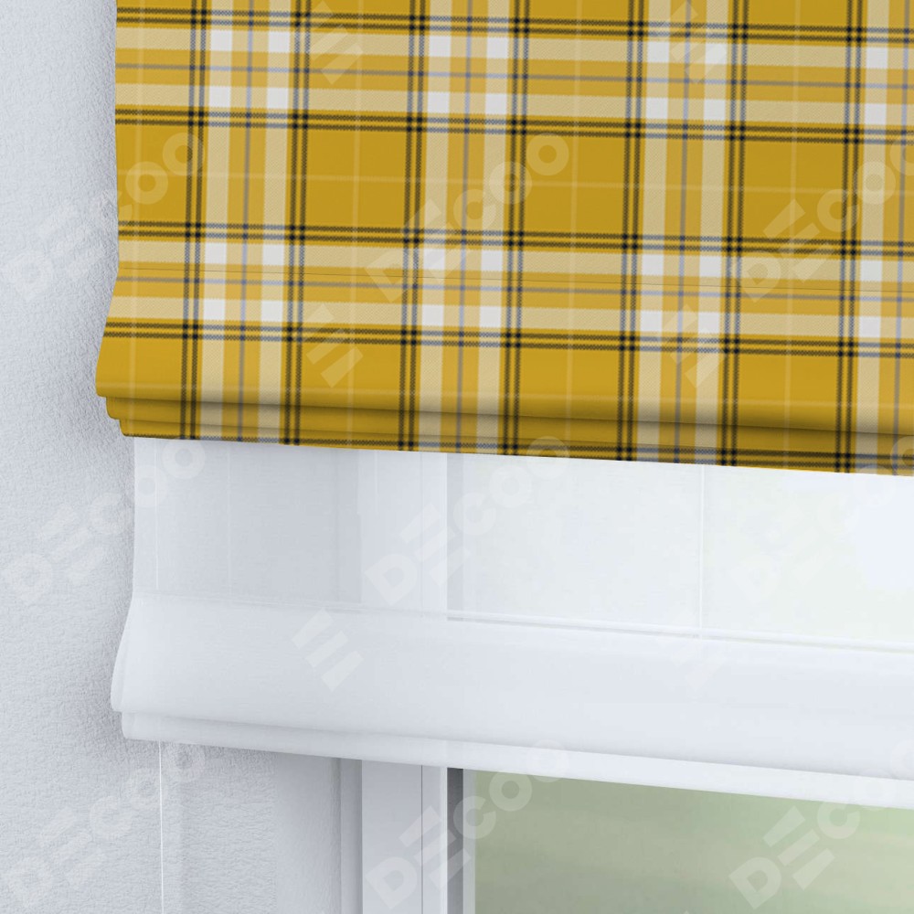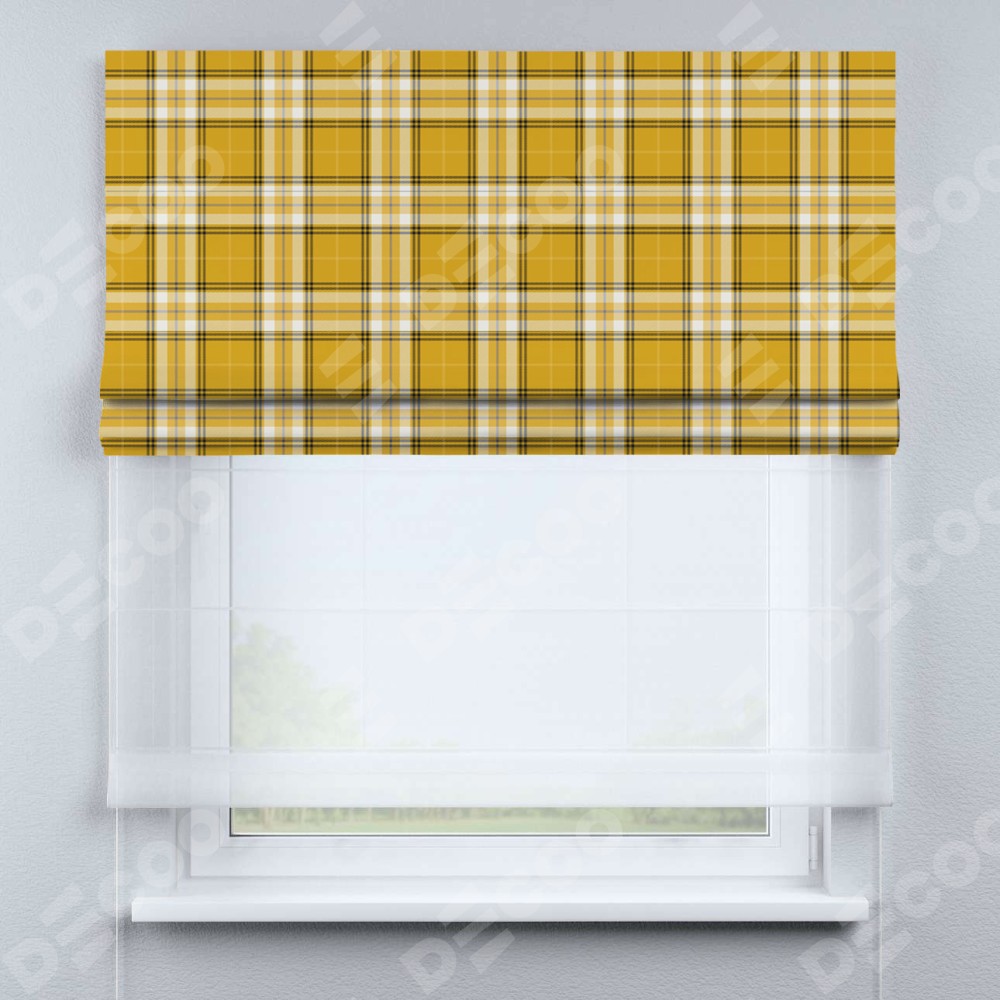 Римская штора день-ночь производителя «Cortin», используется для проёма, пошита из двух полотен, с лицевой блэкаут с нанесением сублимационной печати «Желто-горчичная клетка», вторая ткань тюль (по стандарту комплектуется тюль белого цвета артикул V-01). Имеет универсальный механизм и подходит для монтажа: на потолок, на стену и в нишу.