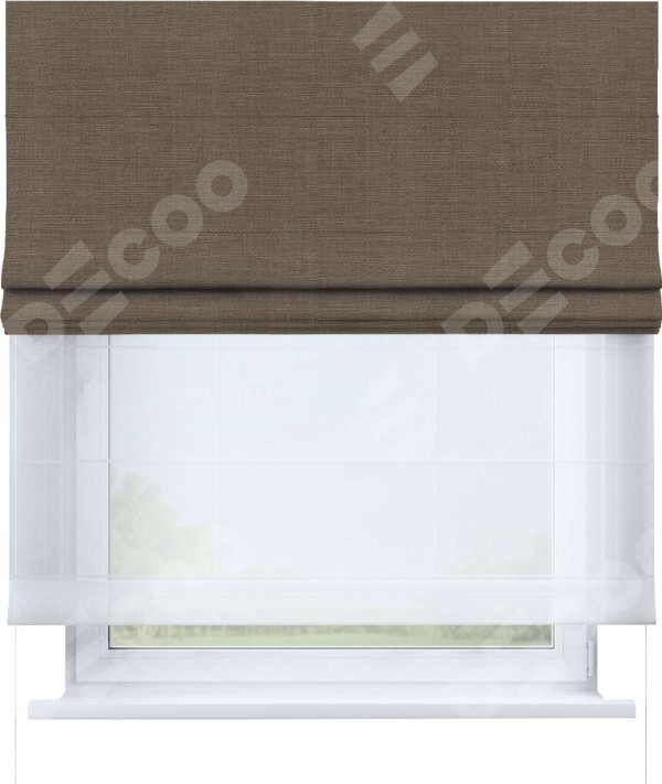 Римская штора день-ночь производителя «Cortin», используется для проёма, пошита из двух полотен, с лицевой стороны лён мокко артикул 7444, вторая ткань тюль (по стандарту комплектуется тюль белого цвета артикул V-01). Имеет универсальный механизм и подходит для монтажа: на потолок, на стену и в нишу.