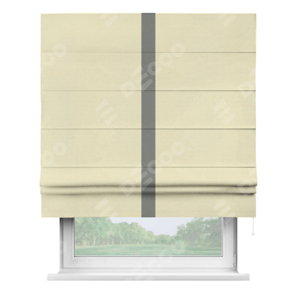 Римская штора производителя «Cortin», используется для проёма, пошита из ткани блэкаут однотонный бежевый, артикул ткани 88283. Отделка шторы кантом «Хайвей», ткань для канта используется из блэкаута однотонного разной расцветки на выбор. Имеет универсальный механизм и подходит для монтажа: на потолок, на стену и в нишу.