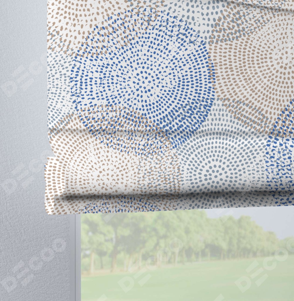 Римская штора производителя «Cortin», используется для проёма, пошита из ткани блэкаут с нанесением сублимационной печати «Абстрактные круги». Данная модель пошита на петлях, комплектуется на выбор круглым карнизом и подходит для монтажа на стену. Римская штора на петлях имеет простую систему регулировки высоты, отличительным преимуществом данной модели является простой способ монтажа. Достаточно повесить ее на трубу и штора готова!