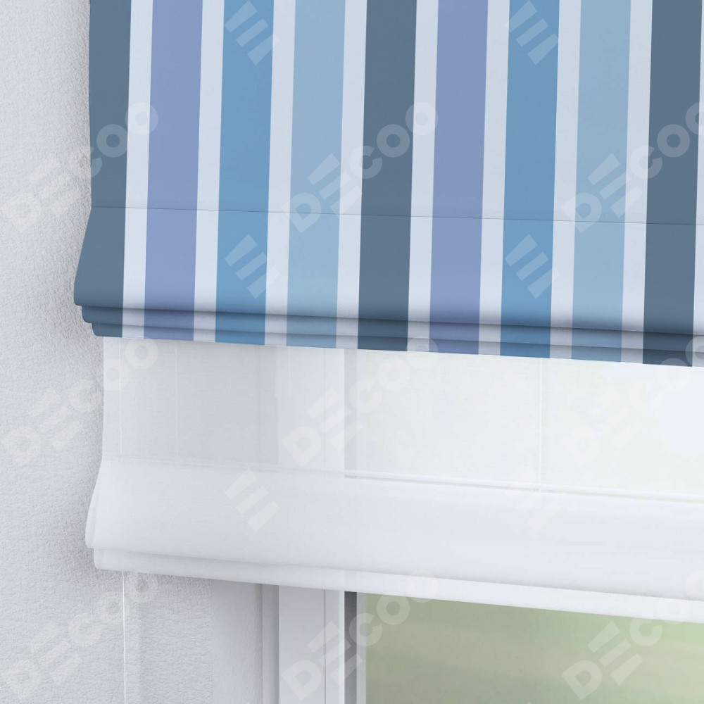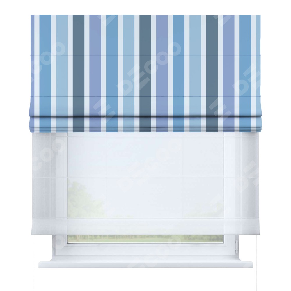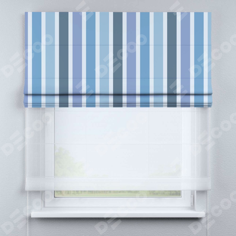 Римская штора день-ночь производителя «Cortin», используется для проёма, пошита из двух полотен, с лицевой блэкаут с нанесением сублимационной печати «Сине-голубые вертикальные полоски», вторая ткань тюль (по стандарту комплектуется тюль белого цвета артикул V-01). Имеет универсальный механизм и подходит для монтажа: на потолок, на стену и в нишу.