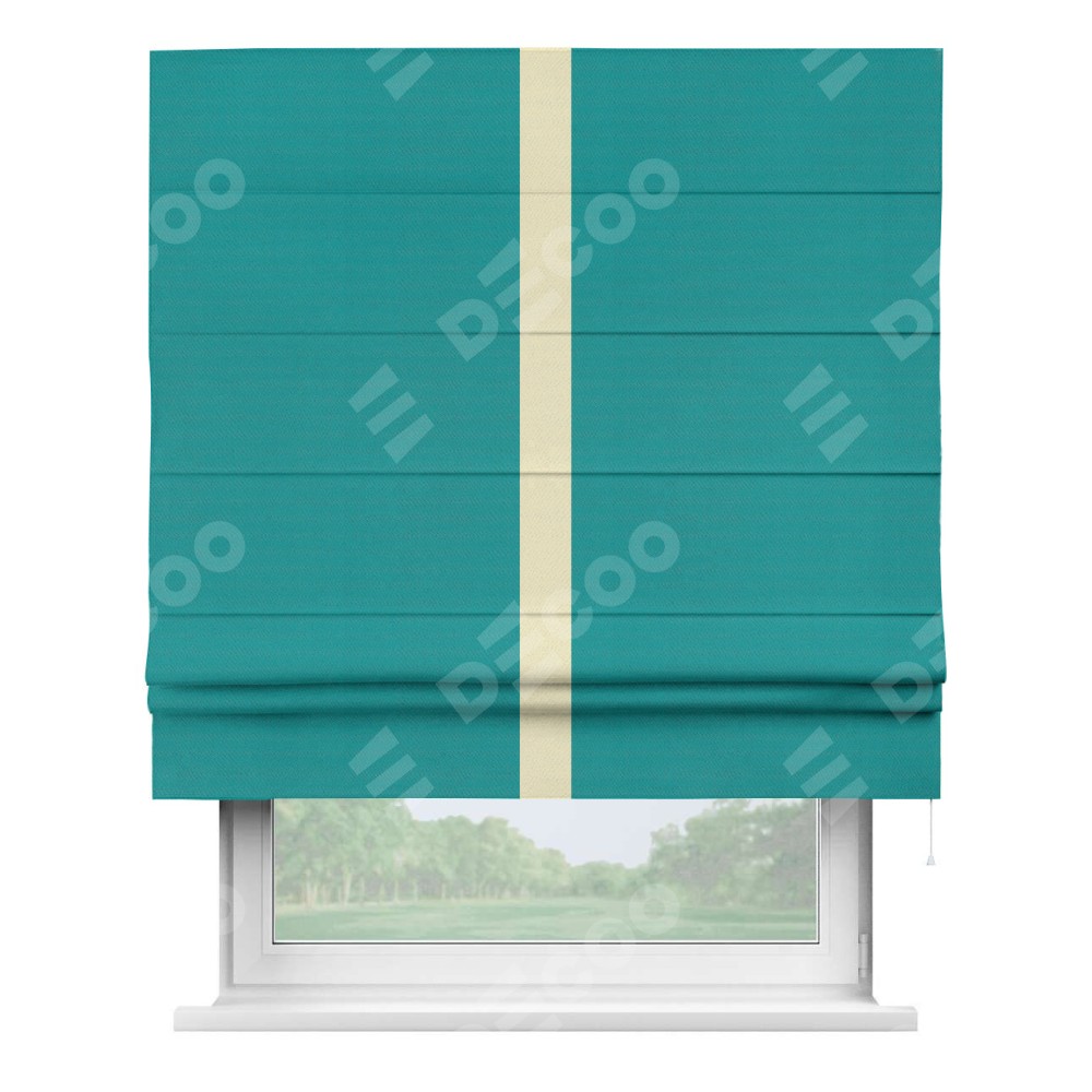 Римская штора производителя «Cortin», используется для проёма, пошита из ткани блэкаут однотонный бирюзовый, артикул ткани 88297. Отделка шторы кантом «Хайвей», ткань для канта используется из блэкаута однотонного разной расцветки на выбор. Имеет универсальный механизм и подходит для монтажа: на потолок, на стену и в нишу.