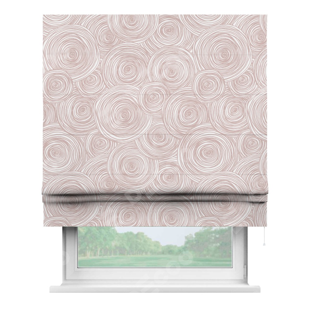 Римская штора производителя «Cortin», используется для проёма, пошита из ткани блэкаут с нанесением сублимационной печати «Бежевые круги». Имеет универсальный механизм и подходит для монтажа: на потолок, на стену и в нишу.