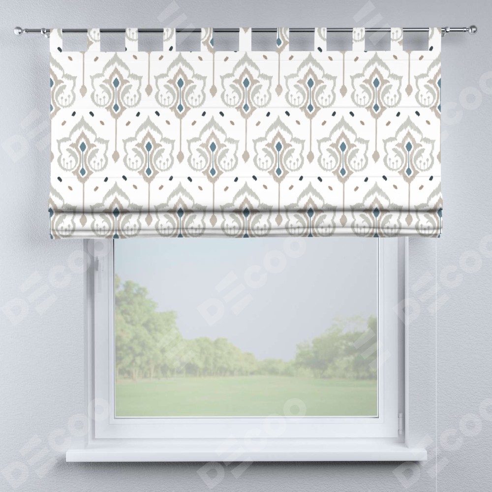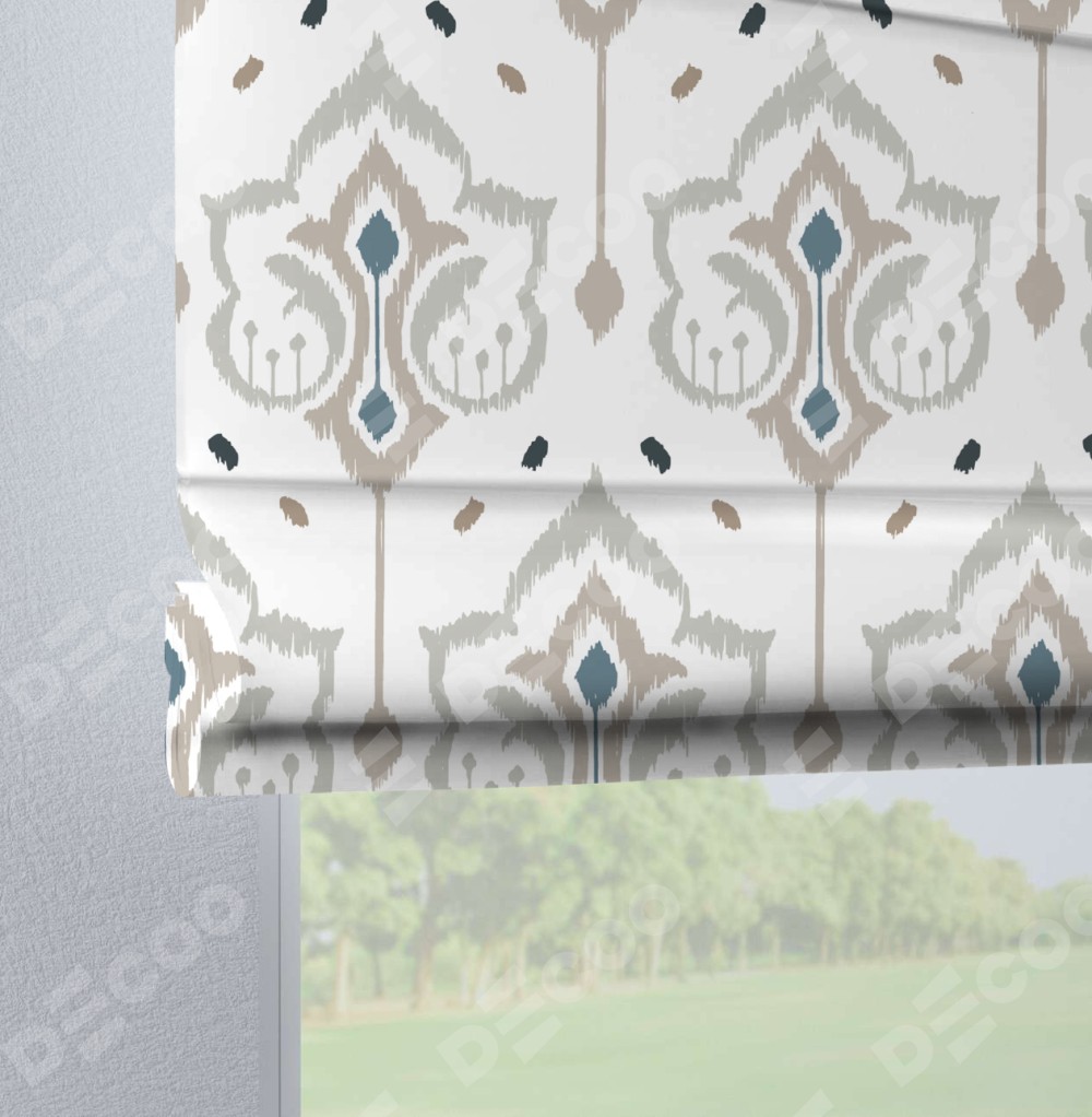 Римская штора производителя «Cortin», используется для проёма, пошита из ткани блэкаут с нанесением сублимационной печати «Икат узор». Данная модель пошита на петлях, комплектуется на выбор круглым карнизом и подходит для монтажа на стену. Римская штора на петлях имеет простую систему регулировки высоты, отличительным преимуществом данной модели является простой способ монтажа. Достаточно повесить ее на трубу и штора готова!
