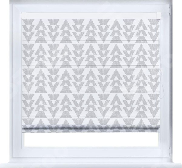 Римская штора производителя «Cortin», устанавливается на створку окна, пошита из ткани блэкаут с нанесением сублимационной печати «Серые стрелки». Штора шьётся по индивидуальным размерам, для данного типа римской шторы возможная ширина от 35 до 150 см., высота до 250 см.