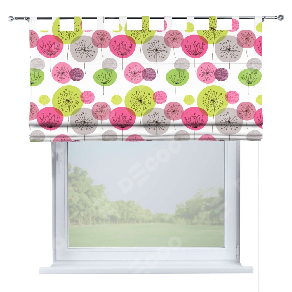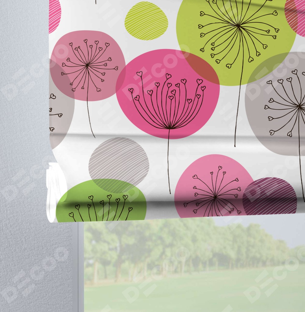 Римская штора производителя «Cortin», используется для проёма, пошита из ткани блэкаут с нанесением сублимационной печати «Цветные одуванчики». Данная модель пошита на петлях, комплектуется на выбор круглым карнизом и подходит для монтажа на стену. Римская штора на петлях имеет простую систему регулировки высоты, отличительным преимуществом данной модели является простой способ монтажа. Достаточно повесить ее на трубу и штора готова!