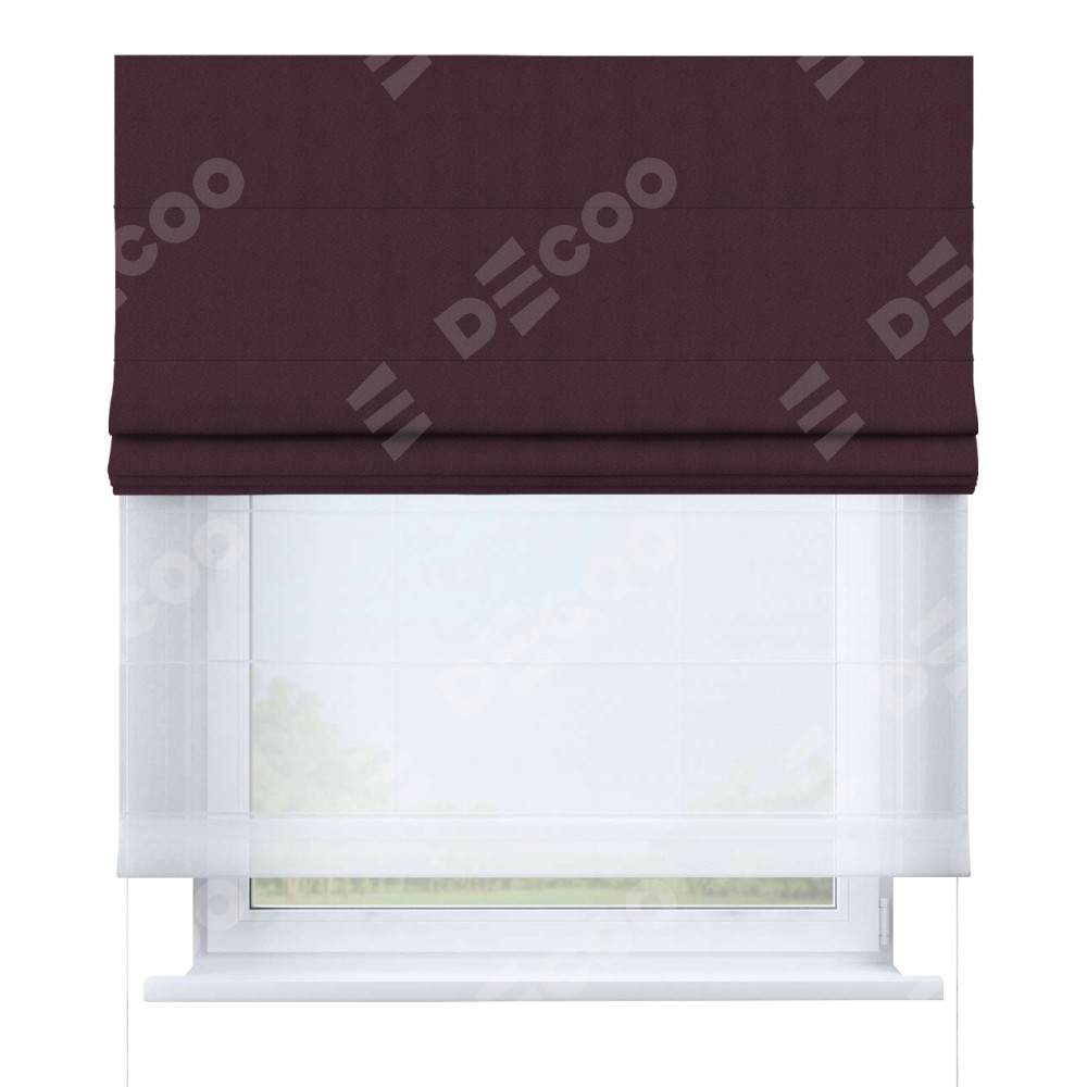 Римская штора день-ночь производителя «Cortin», используется для проёма, пошита из двух полотен, с лицевой стороны блэкаут однотонный сиреневый артикул 29333−2, вторая ткань тюль (по стандарту комплектуется тюль белого цвета артикул V-01). Имеет универсальный механизм и подходит для монтажа: на потолок, на стену и в нишу.