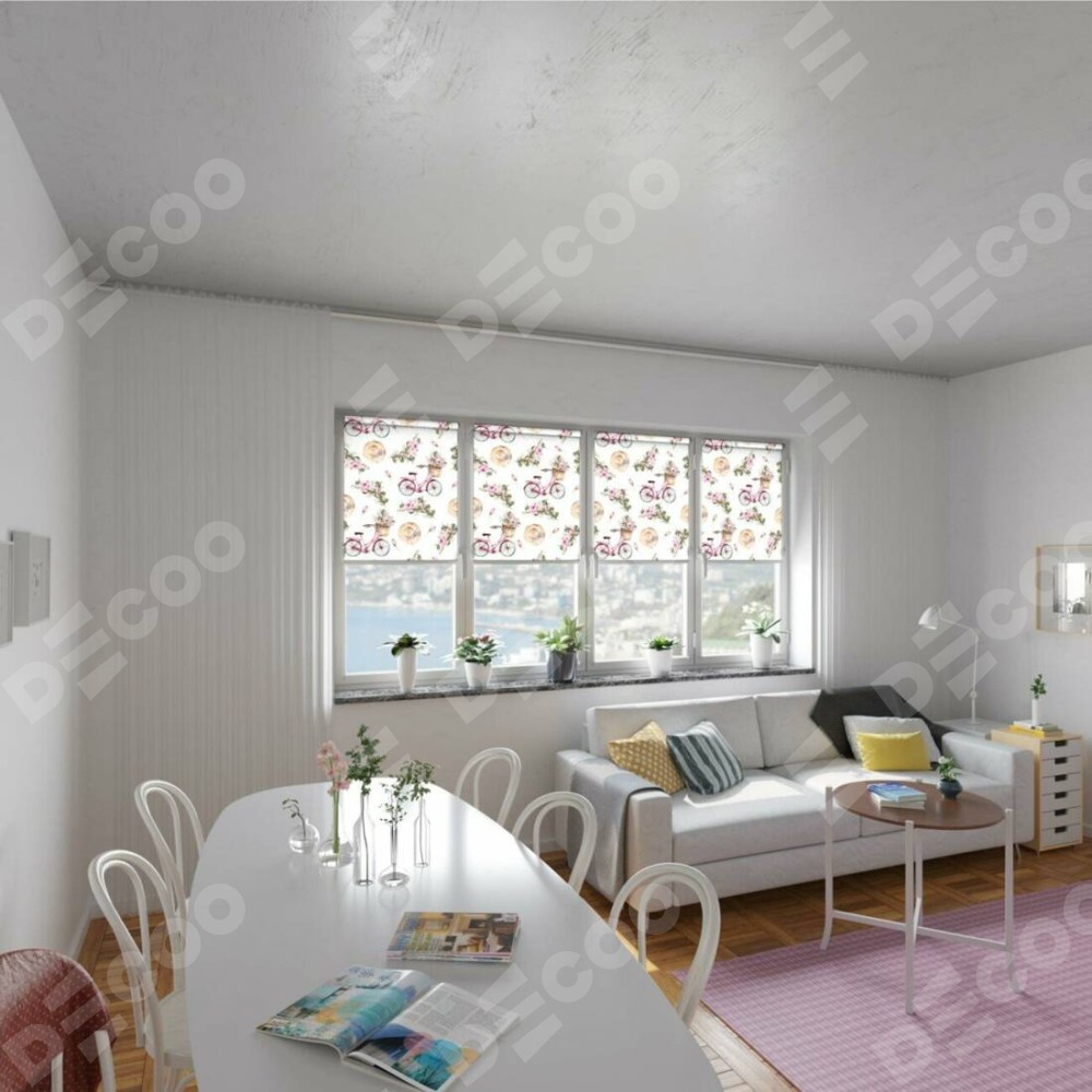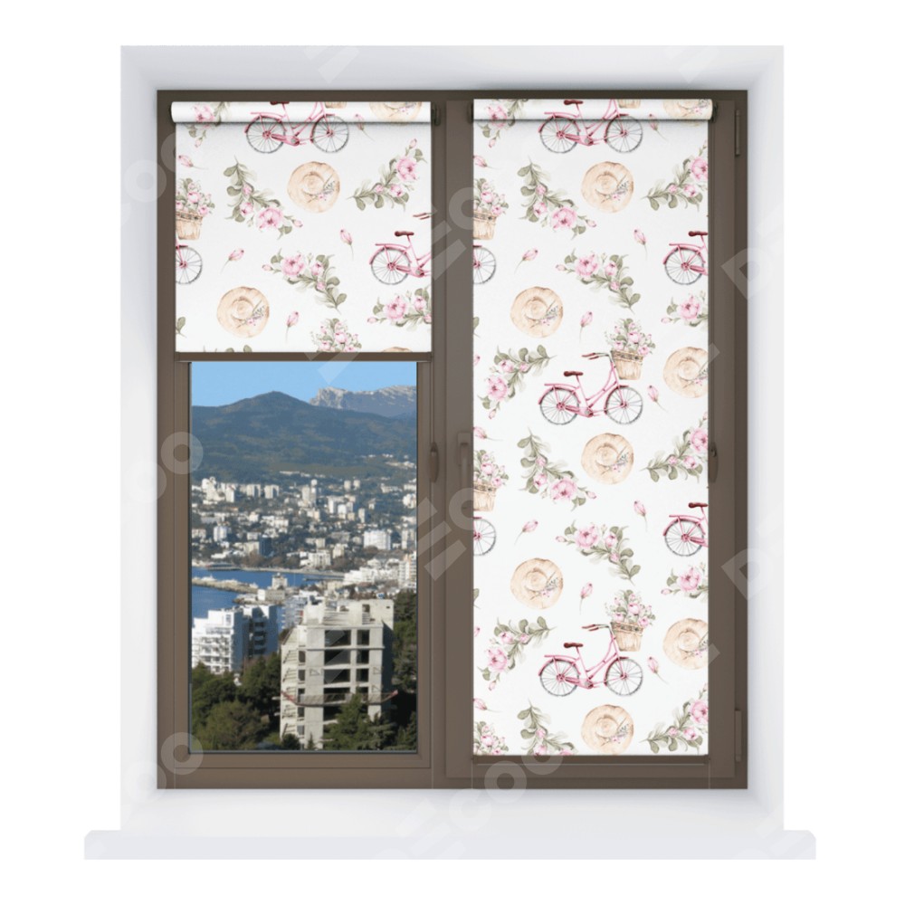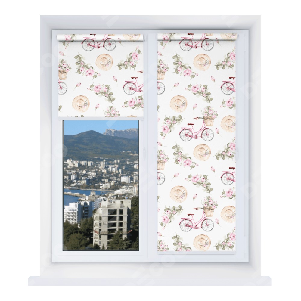 Рулонная штора Мини с принтом Розовый велосипед отлично подойдёт для интерьера: коттедж, для любого интерьера и для балкона.