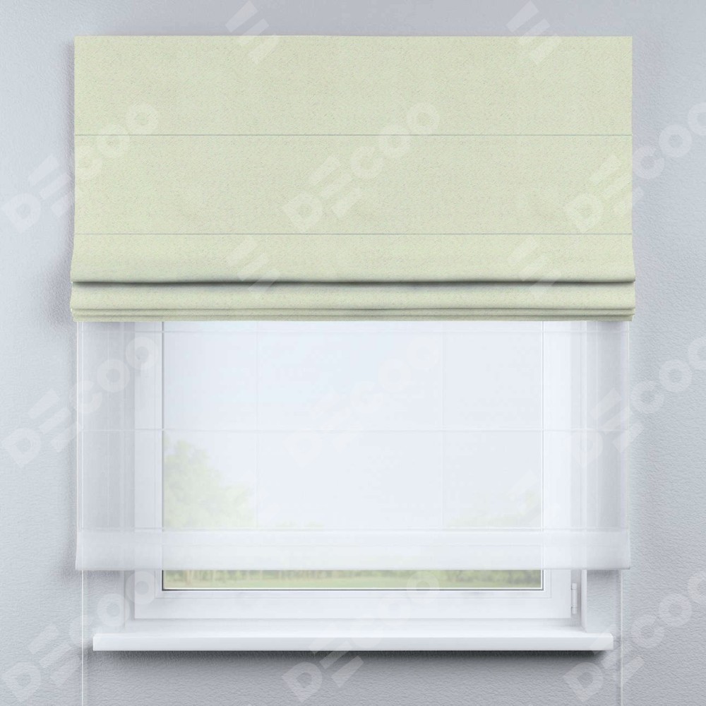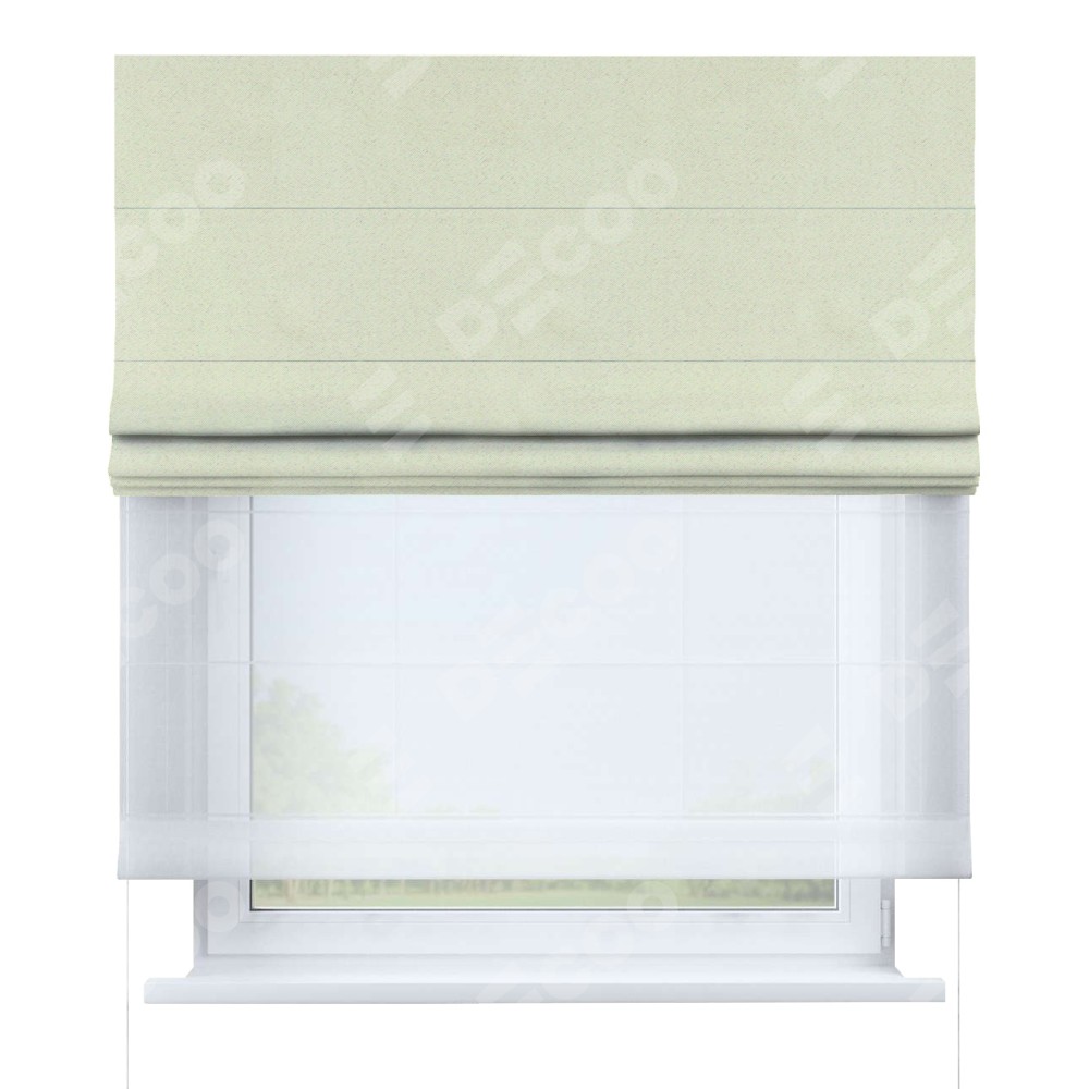 Римская штора день-ночь производителя «Cortin», используется для проёма, пошита из двух полотен, с лицевой стороны блэкаут однотонный сливочный артикул 6668−02, вторая ткань тюль (по стандарту комплектуется тюль белого цвета артикул V-01). Имеет универсальный механизм и подходит для монтажа: на потолок, на стену и в нишу.