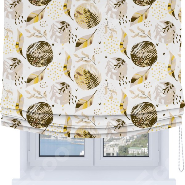 Римская штора Soft производителя «Cortin», используется для проёма, пошита из ткани блэкаут с нанесением сублимационной печати «Золотые листья». Имеет универсальный механизм и подходит для монтажа: на потолок, на стену и в нишу. В отличие от стандартных римских штор, римская штора Soft не имеет горизонтальных вставок и нижнего отвеса. Это позволяет ткани произвольно драпироваться в свободные мягкие складки.
