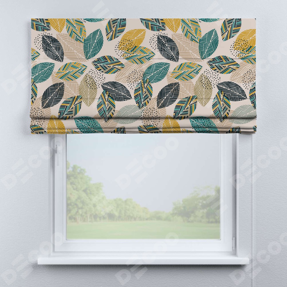 Римская штора производителя «Cortin», используется для проёма, пошита из ткани блэкаут с нанесением сублимационной печати «Листья с орнаментом». Имеет универсальный механизм и подходит для монтажа: на потолок, на стену и в нишу.