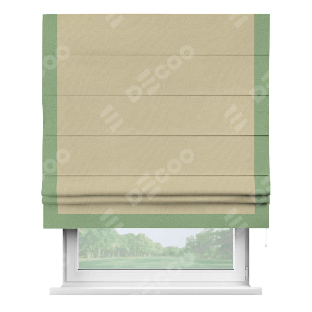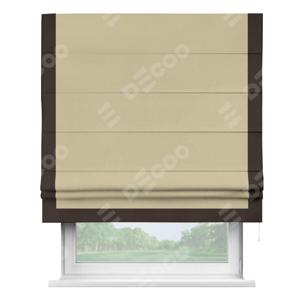 Римская штора производителя «Cortin», используется для проёма, пошита из ткани блэкаут однотонный кофейный, артикул ткани 13130. Отделка шторы кантом «Виктория», ткань для канта используется из блэкаута однотонного разной расцветки на выбор. Имеет универсальный механизм и подходит для монтажа: на потолок, на стену и в нишу.