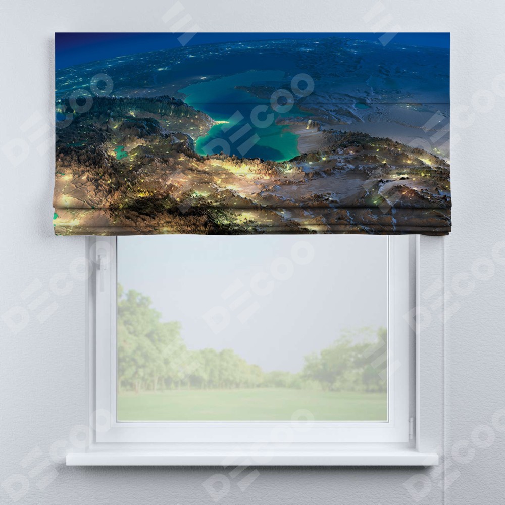 Римская штора производителя «Cortin», используется для проёма, пошита из ткани блэкаут с нанесением сублимационной печати «Ночные огни». Имеет универсальный механизм и подходит для монтажа: на потолок, на стену и в нишу.