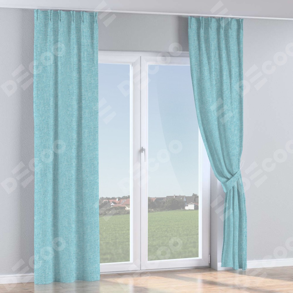 Комплект прямых штор, от производителя «Cortin», пошиты из ткани лён кашемир голубой, артикул ткани 21616. С изнаночной стороны в верхней части штор пристрачивается шторная лента с декоративными складками «Кустик». Для создания элегантных складок прямые шторы шьются по стандарту с коэффициентом 1:2 (на 100 см. ширины проёма 200 см. ширины ткани).