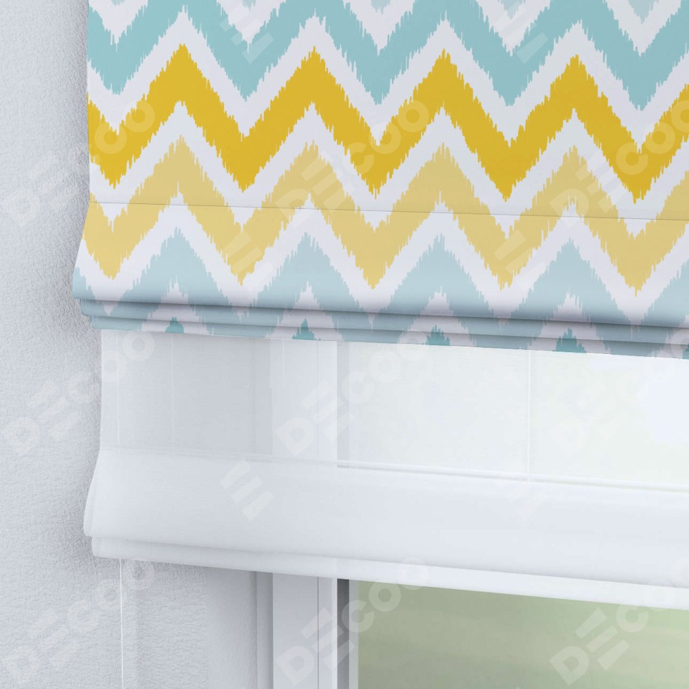 Римская штора день-ночь производителя «Cortin», используется для проёма, пошита из двух полотен, с лицевой блэкаут с нанесением сублимационной печати «Икат шеврон», вторая ткань тюль (по стандарту комплектуется тюль белого цвета артикул V-01). Имеет универсальный механизм и подходит для монтажа: на потолок, на стену и в нишу.