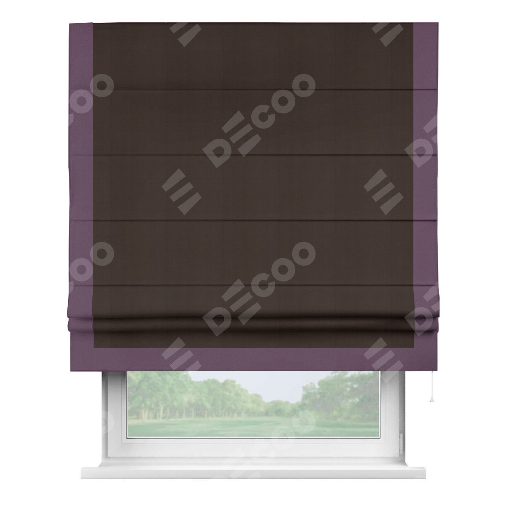 Римская штора производителя «Cortin», используется для проёма, пошита из ткани блэкаут однотонный тёмно-коричневый, артикул ткани 88287. Отделка шторы кантом «Виктория», ткань для канта используется из блэкаута однотонного разной расцветки на выбор. Имеет универсальный механизм и подходит для монтажа: на потолок, на стену и в нишу.