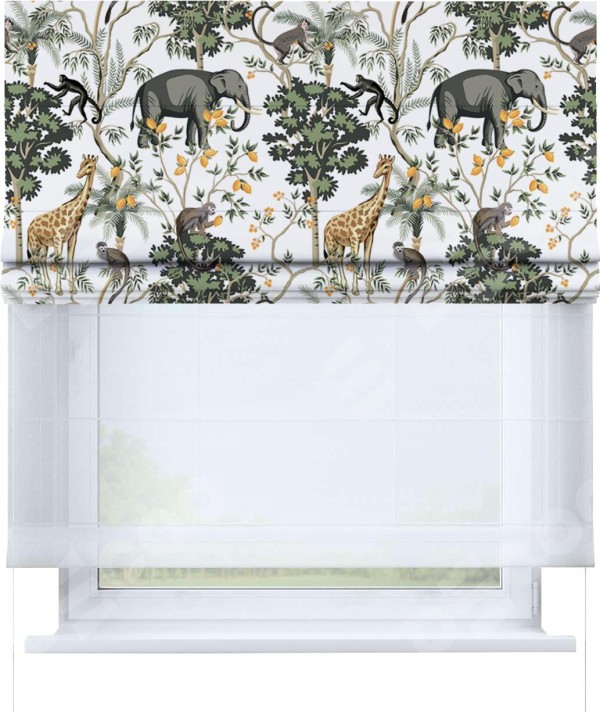 Римская штора день-ночь производителя «Cortin», используется для проёма, пошита из двух полотен, с лицевой блэкаут с нанесением сублимационной печати «Африканские равнины», вторая ткань тюль (по стандарту комплектуется тюль белого цвета артикул V-01). Имеет универсальный механизм и подходит для монтажа: на потолок, на стену и в нишу.