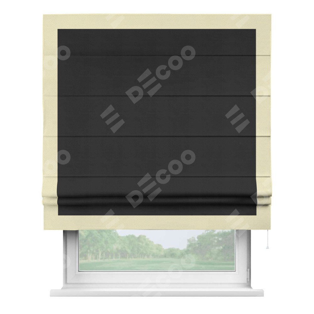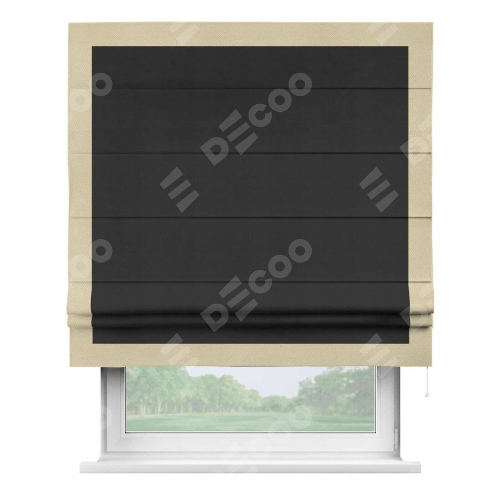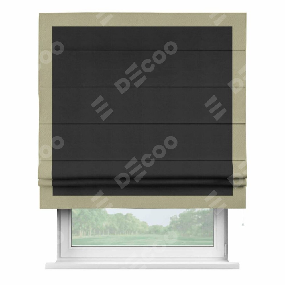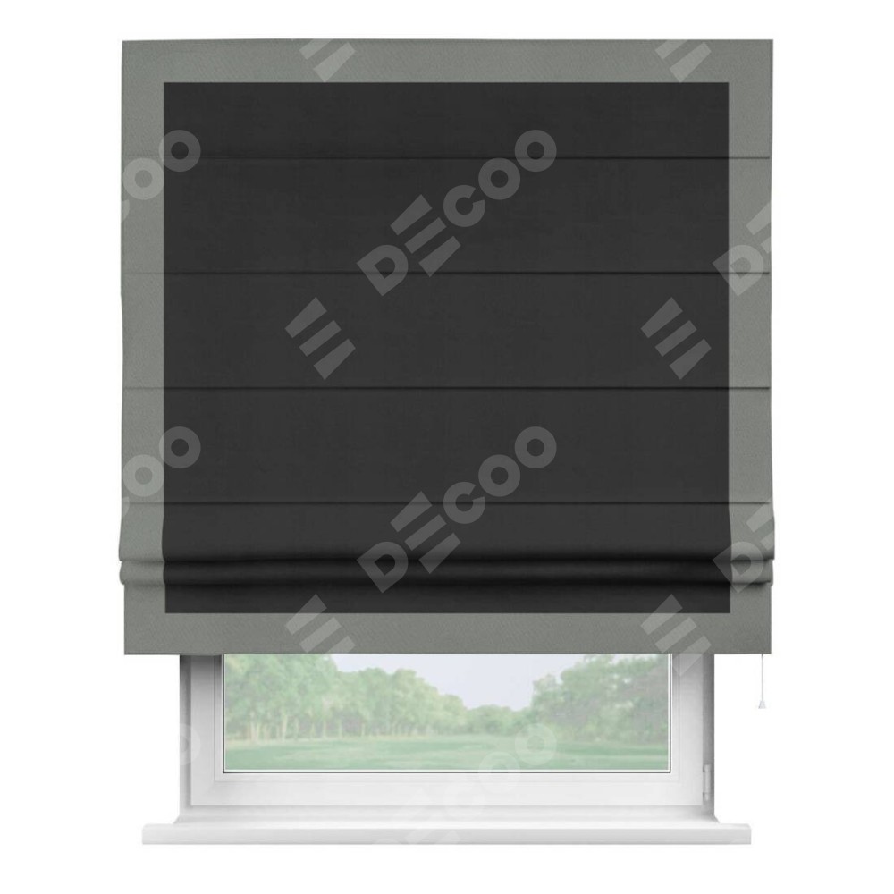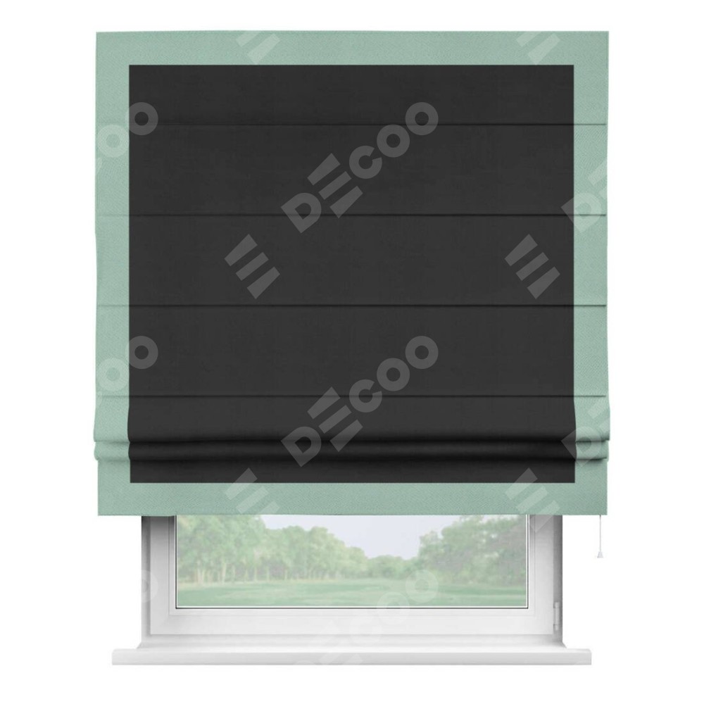 Римская штора производителя «Cortin», используется для проёма, пошита из ткани блэкаут однотонный черный, артикул ткани 79904. Отделка шторы кантом «Чесс», ткань для канта используется из блэкаута однотонного разной расцветки на выбор. Имеет универсальный механизм и подходит для монтажа: на потолок, на стену и в нишу.