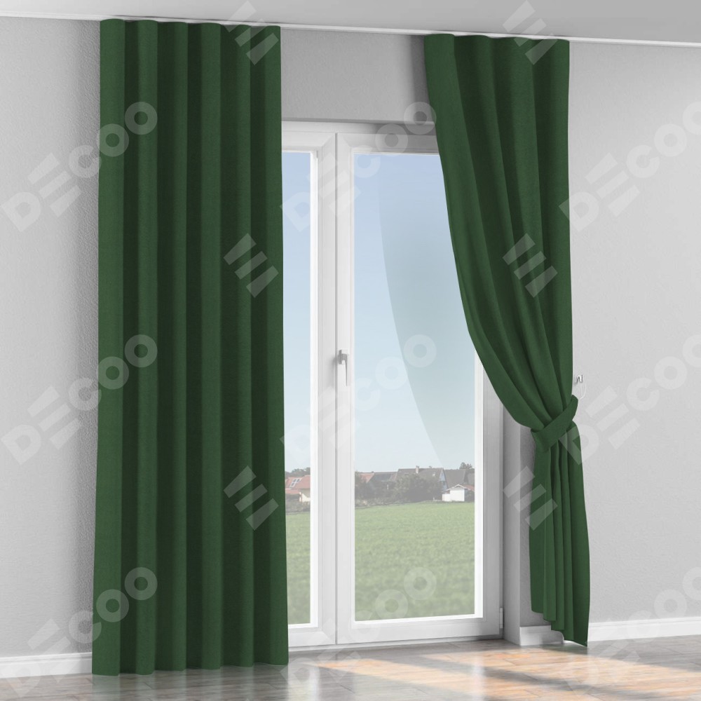 Комплект прямых штор, от производителя «Cortin», пошиты из ткани лён блэкаут зелёный, артикул ткани 69497. С изнаночной стороны в верхней части штор пристрачивается шторная лента с декоративными складками «Волна». Для создания элегантных складок прямые шторы шьются по стандарту с коэффициентом 1:2 (на 100 см. ширины проёма 200 см. ширины ткани).
