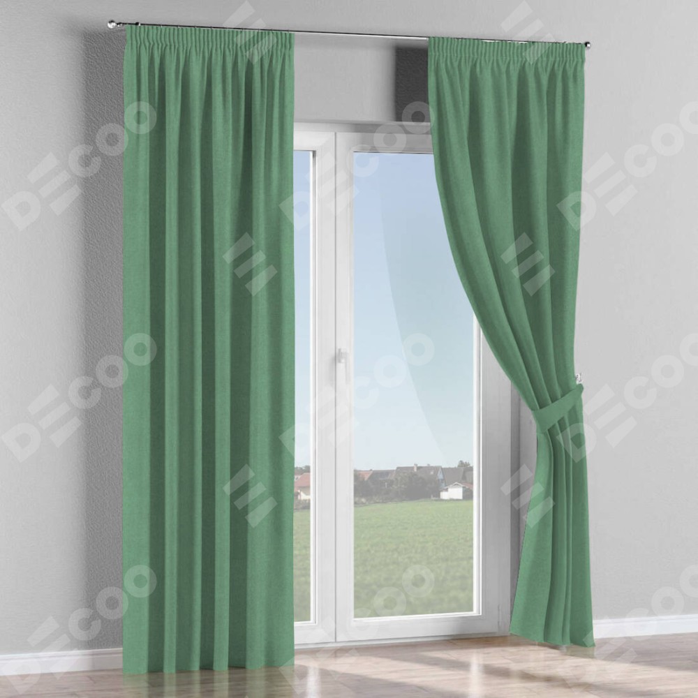 Комплект прямых штор, от производителя «Cortin», пошиты из ткани лён блэкаут светло-бирюзовый, артикул ткани 69443. С изнаночной стороны в верхней части штор пристрачивается шторная лента с декоративными складками «Карандаш». Для создания элегантных складок прямые шторы шьются по стандарту с коэффициентом 1:2 (на 100 см. ширины проёма 200 см. ширины ткани).