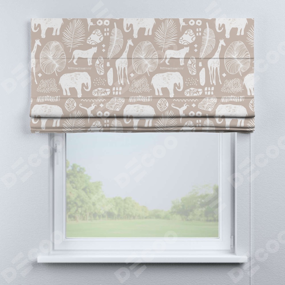 Римская штора производителя «Cortin», используется для проёма, пошита из ткани блэкаут с нанесением сублимационной печати «Африканские животные». Имеет универсальный механизм и подходит для монтажа: на потолок, на стену и в нишу.