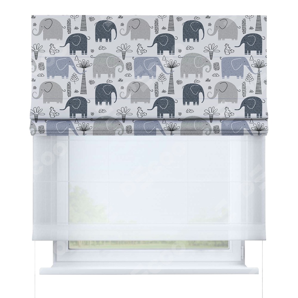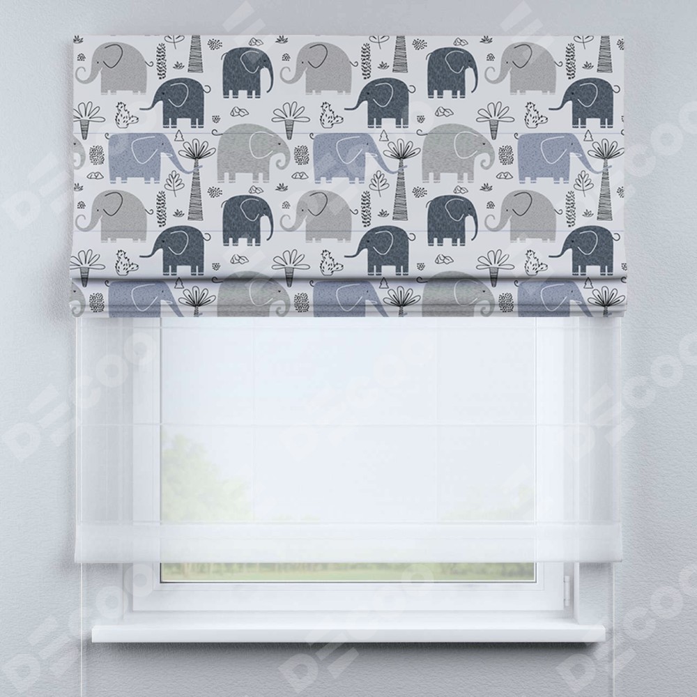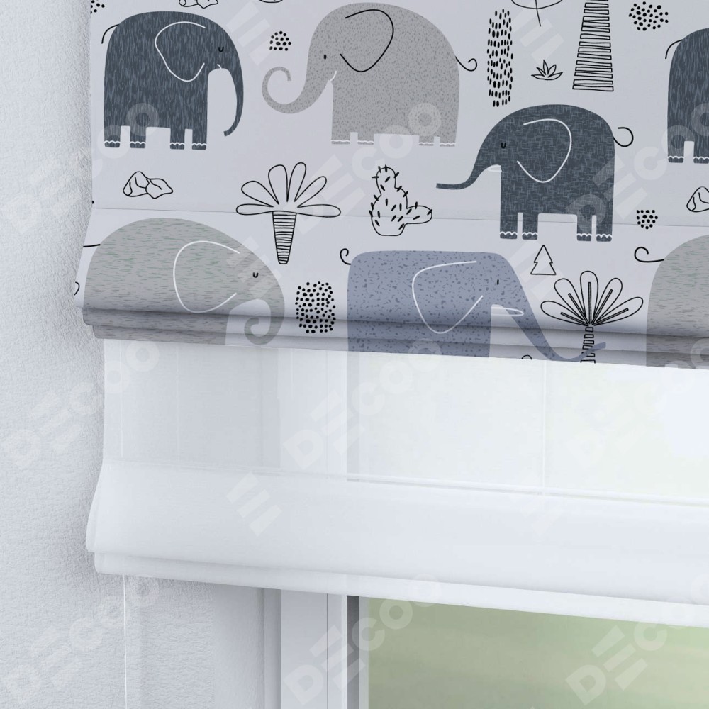 Римская штора день-ночь производителя «Cortin», используется для проёма, пошита из двух полотен, с лицевой блэкаут с нанесением сублимационной печати «Серые слоники», вторая ткань тюль (по стандарту комплектуется тюль белого цвета артикул V-01). Имеет универсальный механизм и подходит для монтажа: на потолок, на стену и в нишу.