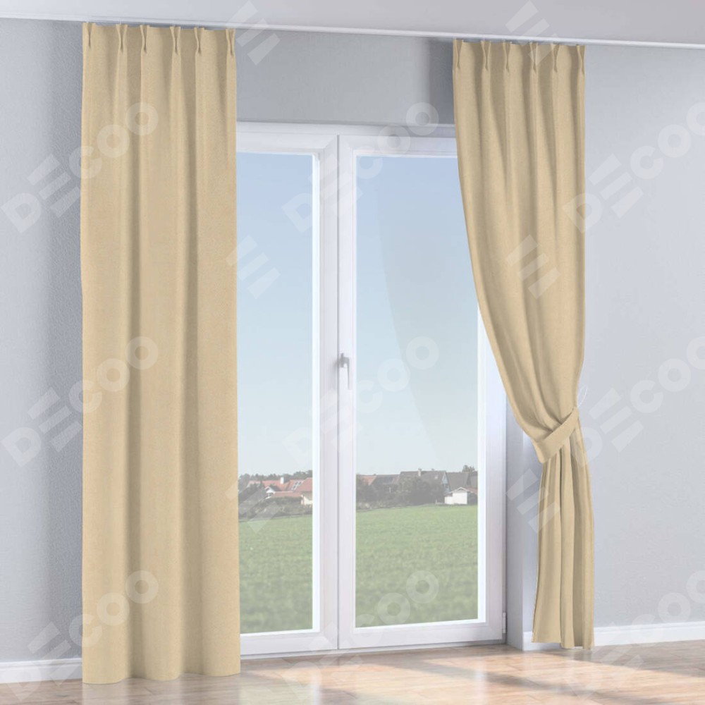 Комплект прямых штор, от производителя «Cortin», пошиты из ткани блэкаут однотонный кофейно-бежевый, артикул ткани 12095−1. С изнаночной стороны в верхней части штор пристрачивается шторная лента с декоративными складками «Кустик». Для создания элегантных складок прямые шторы шьются по стандарту с коэффициентом 1:2 (на 100 см. ширины проёма 200 см. ширины ткани).
