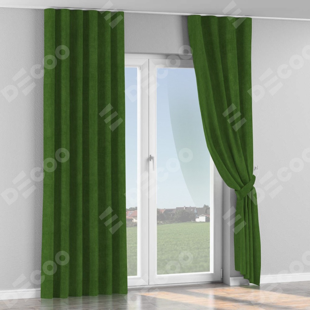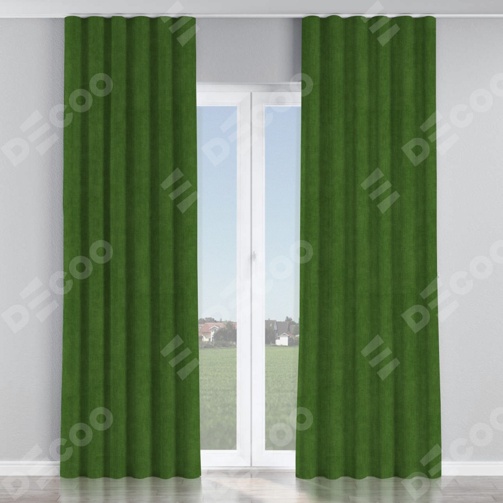 Комплект прямых штор, от производителя «Cortin», пошиты из ткани вельвет тёмно-салатовый, артикул ткани 33805. С изнаночной стороны в верхней части штор пристрачивается шторная лента с декоративными складками «Волна». Для создания элегантных складок прямые шторы шьются по стандарту с коэффициентом 1:2 (на 100 см. ширины проёма 200 см. ширины ткани).