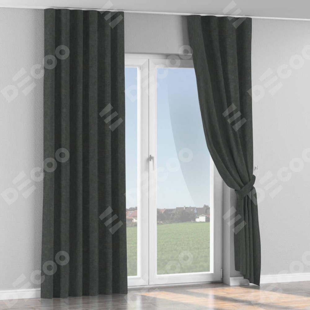 Комплект прямых штор, от производителя «Cortin», пошиты из ткани вельвет тёмно-серый, артикул ткани 33811. С изнаночной стороны в верхней части штор пристрачивается шторная лента с декоративными складками «Волна». Для создания элегантных складок прямые шторы шьются по стандарту с коэффициентом 1:2 (на 100 см. ширины проёма 200 см. ширины ткани).