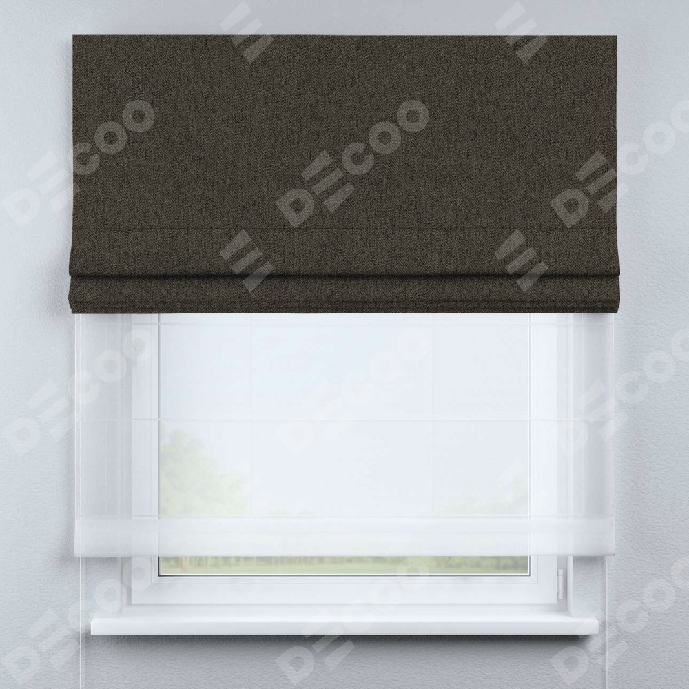 Римская штора день-ночь производителя «Cortin», используется для проёма, пошита из двух полотен, с лицевой стороны твид блэкаут тёмно-коричневый артикул 21584, вторая ткань тюль (по стандарту комплектуется тюль белого цвета артикул V-01). Имеет универсальный механизм и подходит для монтажа: на потолок, на стену и в нишу.
