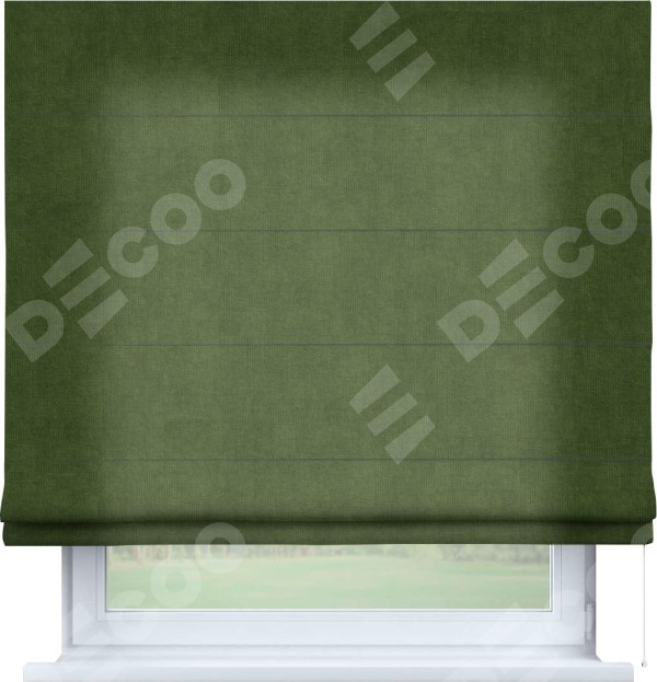 Римская штора производителя «Cortin», используется для проёма, пошита из ткани вельвет тёмно-салатовый, артикул ткани 33805. Имеет универсальный механизм и подходит для монтажа: на потолок, на стену и в нишу.