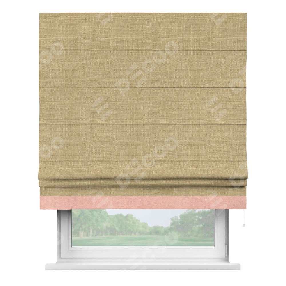 Римская штора производителя «Cortin», используется для проёма, пошита из ткани лён бежевый, артикул 7442. Отделка шторы кантом «Джестер», ткань для канта используется из льна разной расцветки на выбор. Имеет универсальный механизм и подходит для монтажа: на потолок, на стену и в нишу.