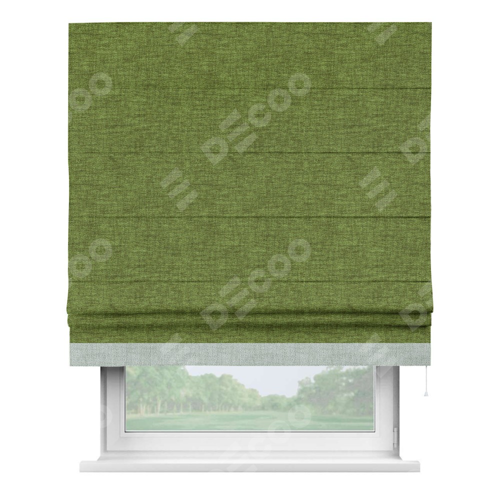 Римская штора производителя «Cortin», используется для проёма, пошита из ткани рогожка димаут салатовый, артикул 80423. Отделка шторы кантом «Джестер», ткань для канта используется из рогожки димаут разной расцветки на выбор. Имеет универсальный механизм и подходит для монтажа: на потолок, на стену и в нишу.
