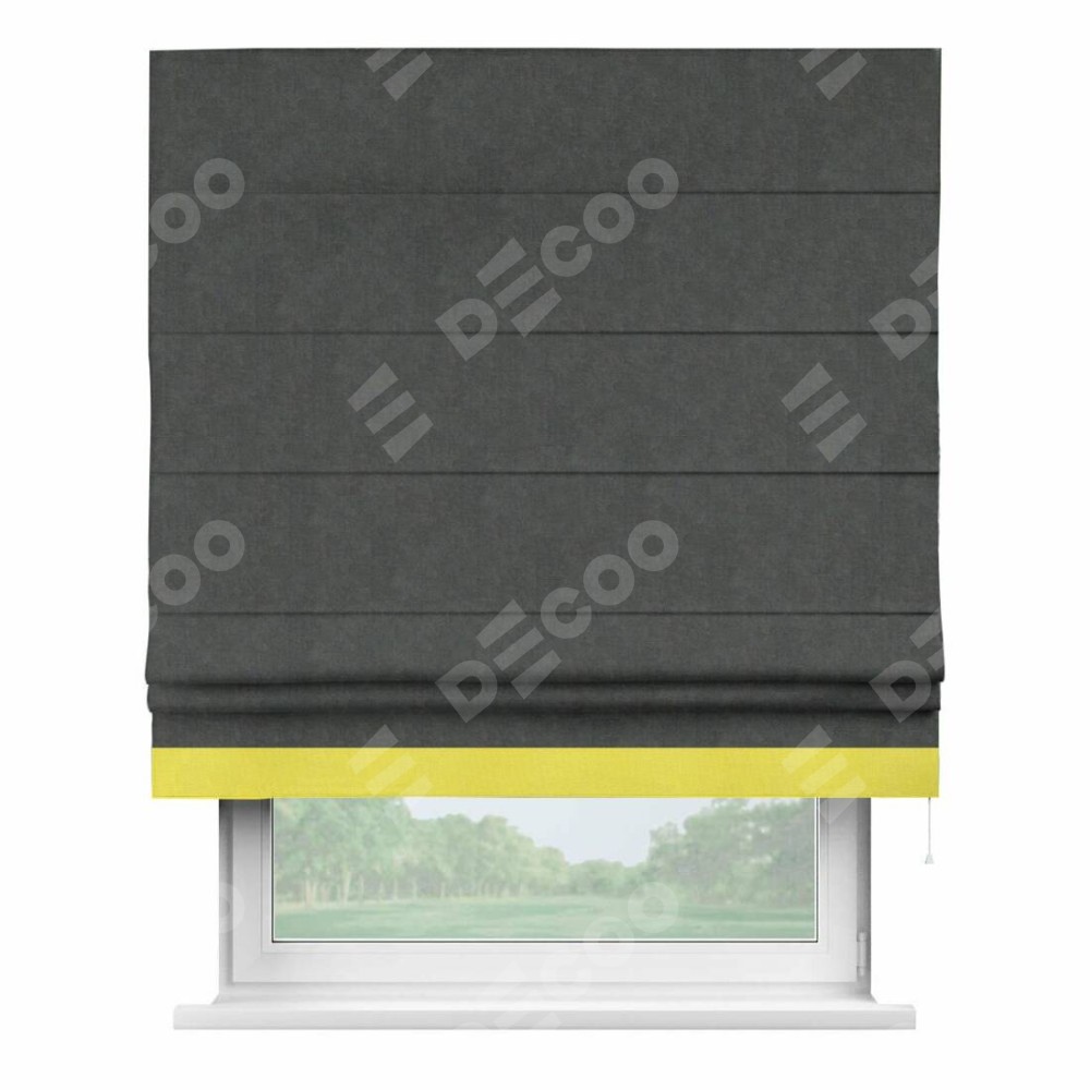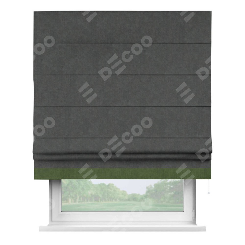 Римская штора производителя «Cortin», используется для проёма, пошита из ткани вельвет тёмно-серый, артикул ткани 33811. Отделка шторы кантом «Джестер», ткань для канта используется из вельвета разной расцветки на выбор. Имеет универсальный механизм и подходит для монтажа: на потолок, на стену и в нишу.